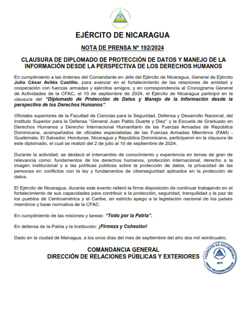 En cumplimiento a las órdenes del Comandante en Jefe del Ejército de Nicaragua, General de Ejército Julio César Avilés Castillo, para avanzar en el fortalecimiento de las relaciones de amistad y cooperación con fuerzas armadas y ejércitos amigos; y en correspondencia al Cronograma General de Actividades de la CFAC, el 10 de septiembre de 2024, el Ejército de Nicaragua participó en la clausura del “Diplomado de Protección de Datos y Manejo de la Información desde la perspectiva de los Derechos Humanos”.