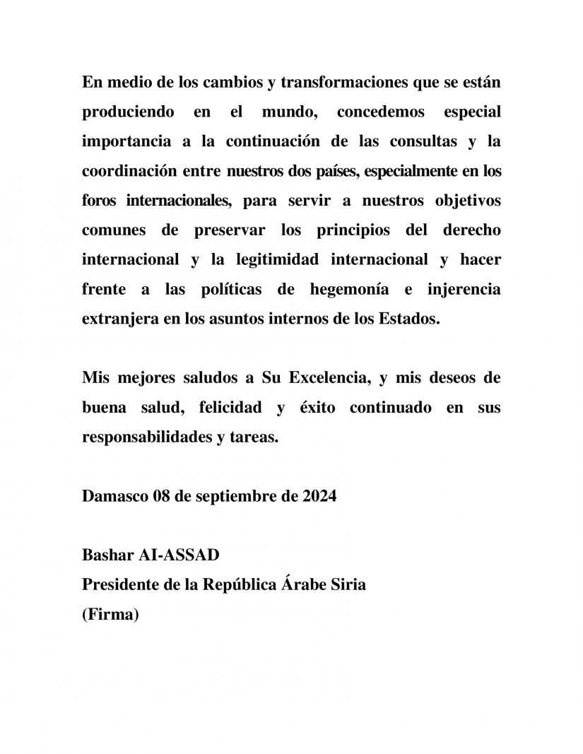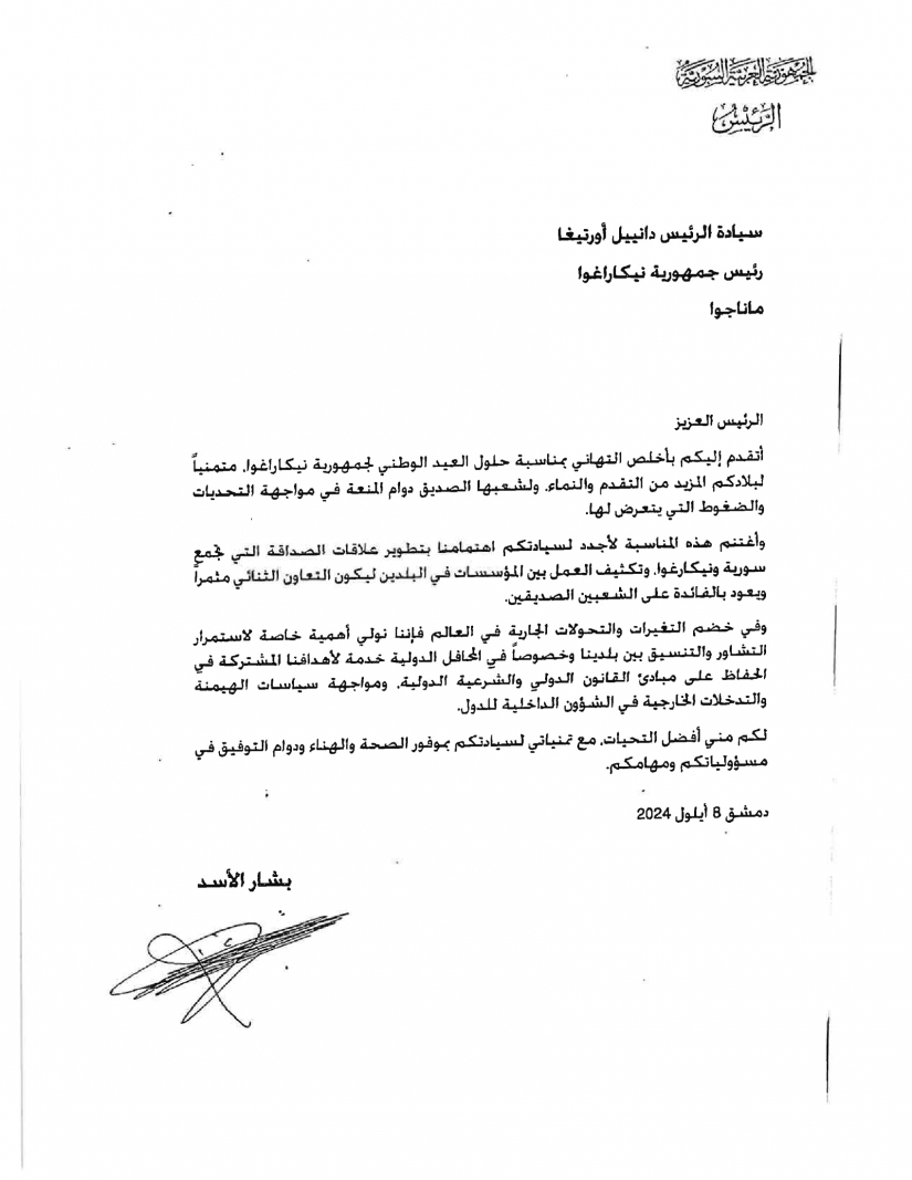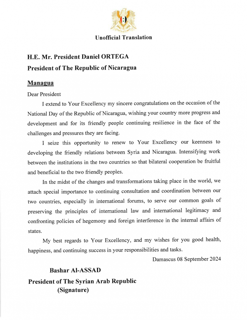 Mensaje de Felicitación del Compañero Bashar Al-Assad, Presidente de la República Árabe Siria, a nuestro Pueblo y Gobierno, en ocasión de la Independencia de Nicaragua.