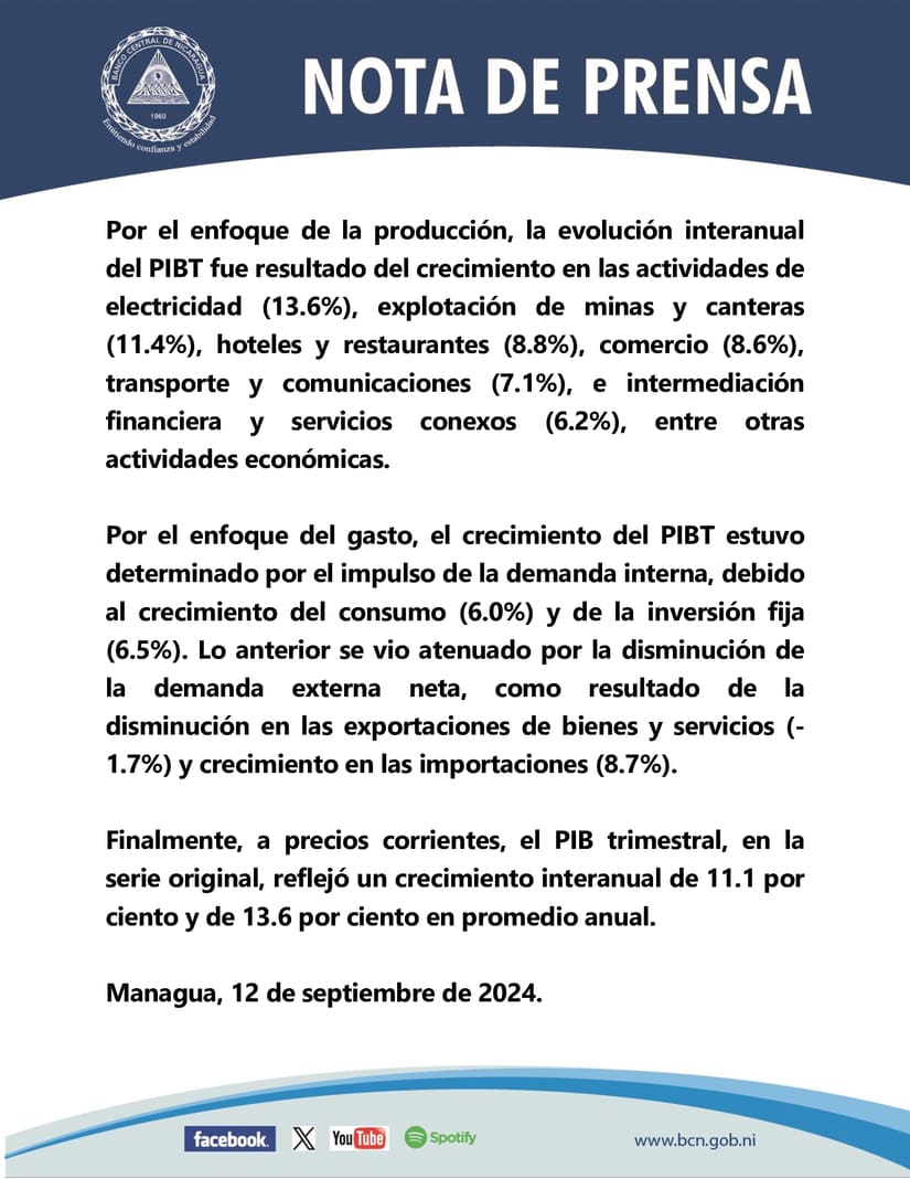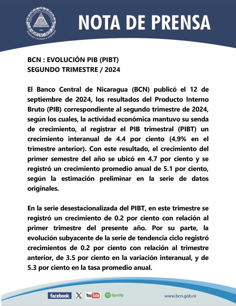 El Banco Central de Nicaragua (BCN) publicó el 12 de septiembre de 2024, los resultados del Producto Interno Bruto (PIB) correspondiente al segundo trimestre de 2024, según los cuales, la actividad económica mantuvo su senda de crecimiento, al registrar el PIB trimestral (PIBT) un crecimiento interanual de 4.4 por ciento (4.9% en el trimestre anterior). Con este resultado, el crecimiento del primer semestre del año se ubicó en 4.7 por ciento y se registró un crecimiento promedio anual de 5.1 por ciento, según la estimación preliminar en la serie de datos originales.
