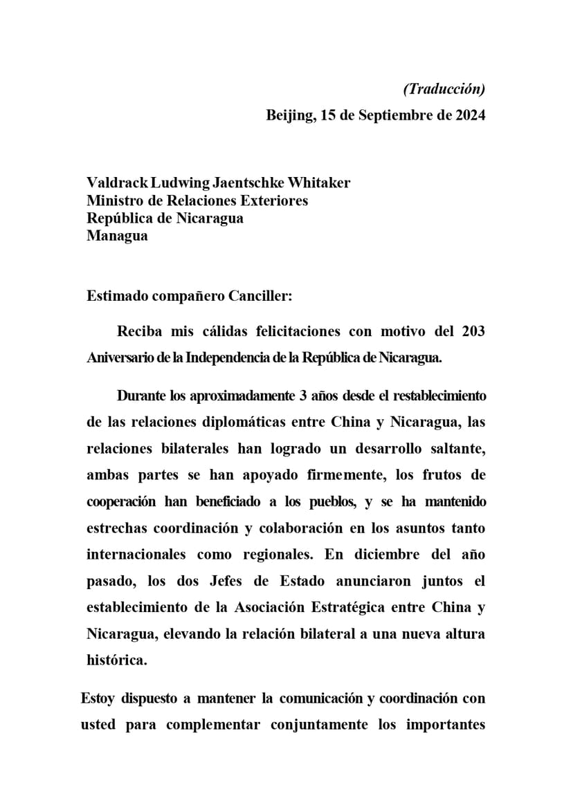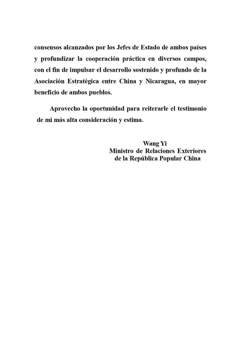 Estoy dispuesto a mantener la comunicación y coordinación con usted para complementar conjuntamente los importantes consensos alcanzados por los Jefes de Estado de ambos países y profundizar la cooperación práctica en diversos campos, con el fin de impulsar el desarrollo sostenido y profundo de la Asociación Estratégica entre China y Nicaragua, en mayor beneficio de ambos pueblos.