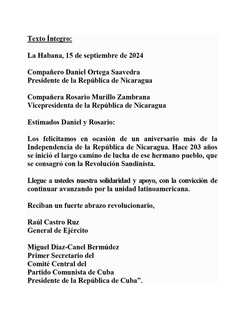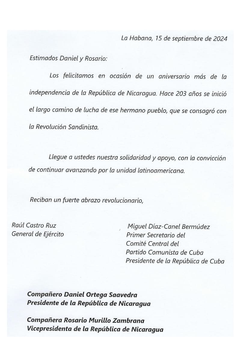 Mensaje de Felicitación de los Compañeros, General de Ejército Raúl Castro Ruz, Líder de la Revolución Cubana, y Miguel Díaz-Canel, Presidente de la República de Cuba y Primer Secretario del Comité Central del Partido Comunista de Cuba, a nuestro Pueblo y Gobierno, en ocasión del 203 Aniversario de la Independencia de Nicaragua.