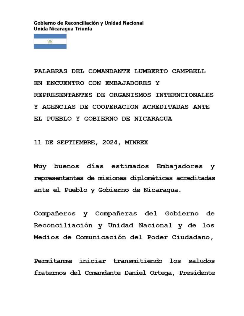 PALABRAS DEL COMANDANTE LUMBERTO CAMPBELL EN ENCUENTRO CON EMBAJADORES Y REPRESENTANTES DE ORGANISMOS INTERNCIONALES Y AGENCIAS DE COOPERACION ACREDITADAS ANTE EL PUEBLO Y GOBIERNO DE NICARAGUA