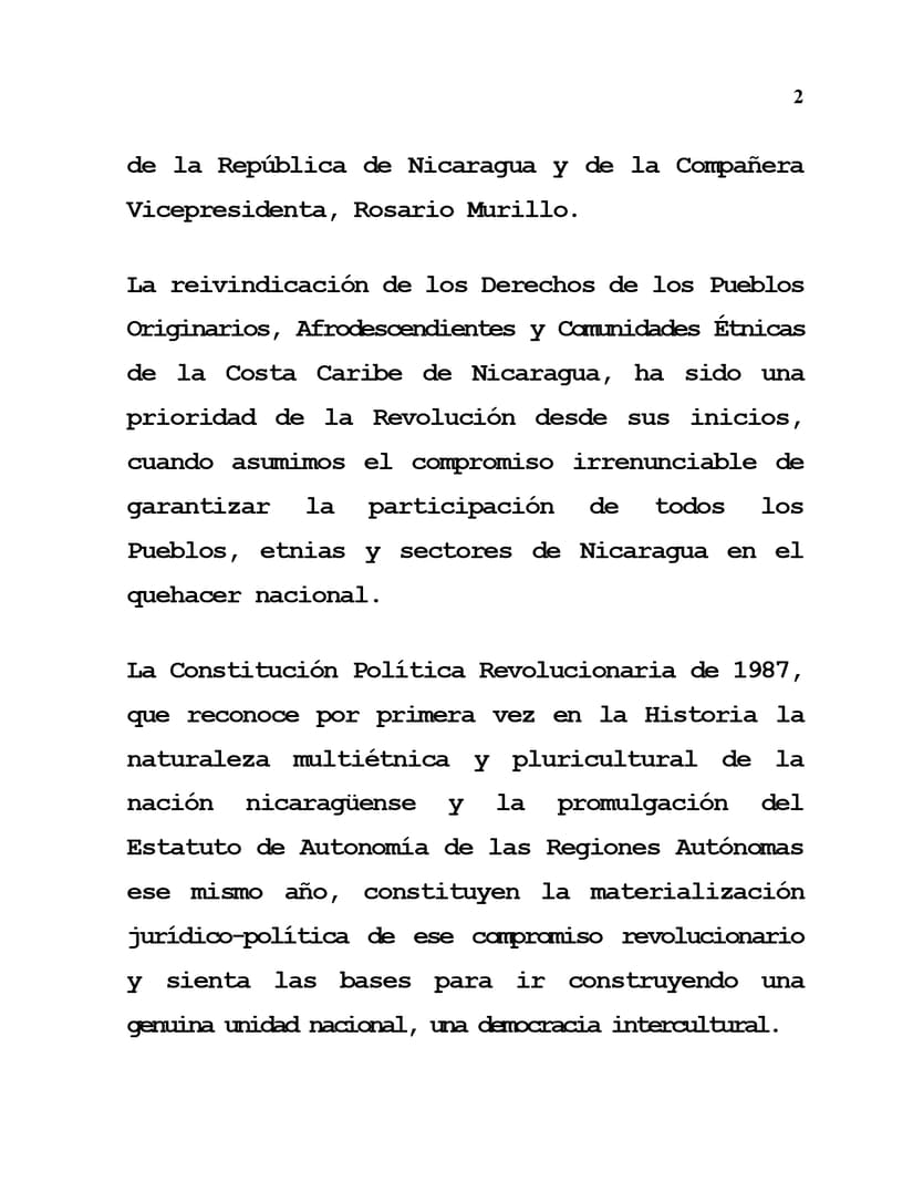 La Constitución Política Revolucionaria de 1987, que reconoce por primera vez en la Historia la naturaleza multiétnica y pluricultural de la nación nicaragüense y la promulgación del Estatuto de Autonomía de las Regiones Autónomas ese mismo año, constituyen la materialización jurídico-política de ese compromiso revolucionario y sienta las bases para ir construyendo una genuina unidad nacional, una democracia intercultural.
