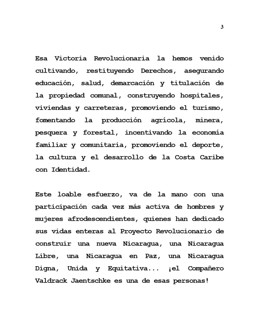 Este loable esfuerzo, va de la mano con una participación cada vez más activa de hombres y mujeres afrodescendientes, quienes han dedicado sus vidas enteras al Proyecto Revolucionario de construir una nueva Nicaragua, una Nicaragua Libre, una Nicaragua en Paz, una Nicaragua Digna, Unida y Equitativa... ¡el Compañero Valdrack Jaentschke es una de esas personas!