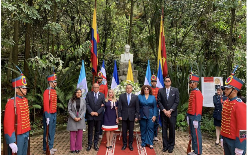 Los Embajadores depositaron ofrenda floral en el Monumento a Simón Bolívar, en el Acto se destacó la gesta de nuestros Próceres quienes, mediante su lucha e ideas consiguieron la emancipación política de nuestra Región, construyendo nuestros destinos como Naciones Libres, Independientes, Prósperas y Soberanas.