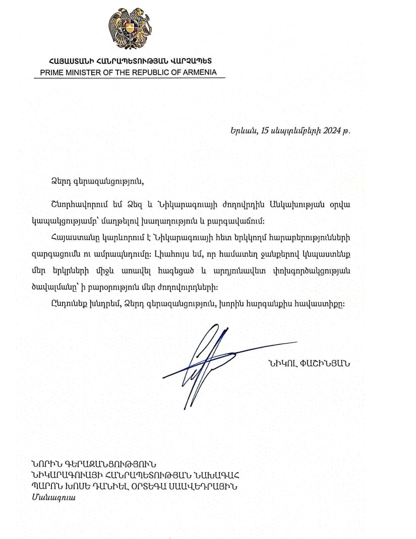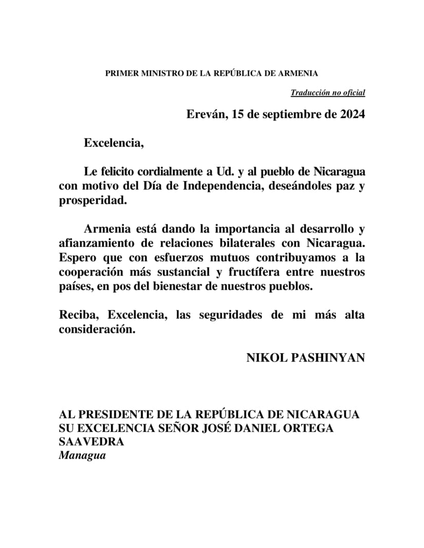 Mensaje de Felicitación del Compañero Nikol Pashinyan, Primer Ministro de la República de Armenia, a nuestro Pueblo y Gobierno, en ocasión del 203 Aniversario de la Independencia de Nicaragua.