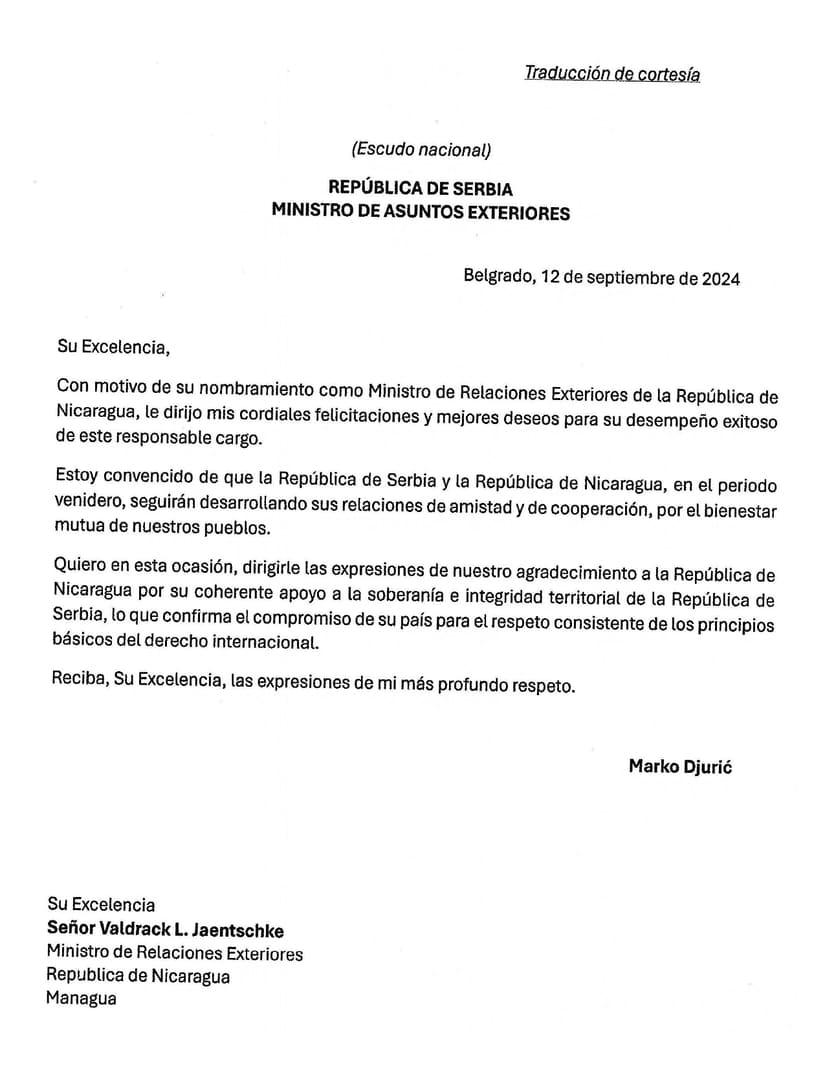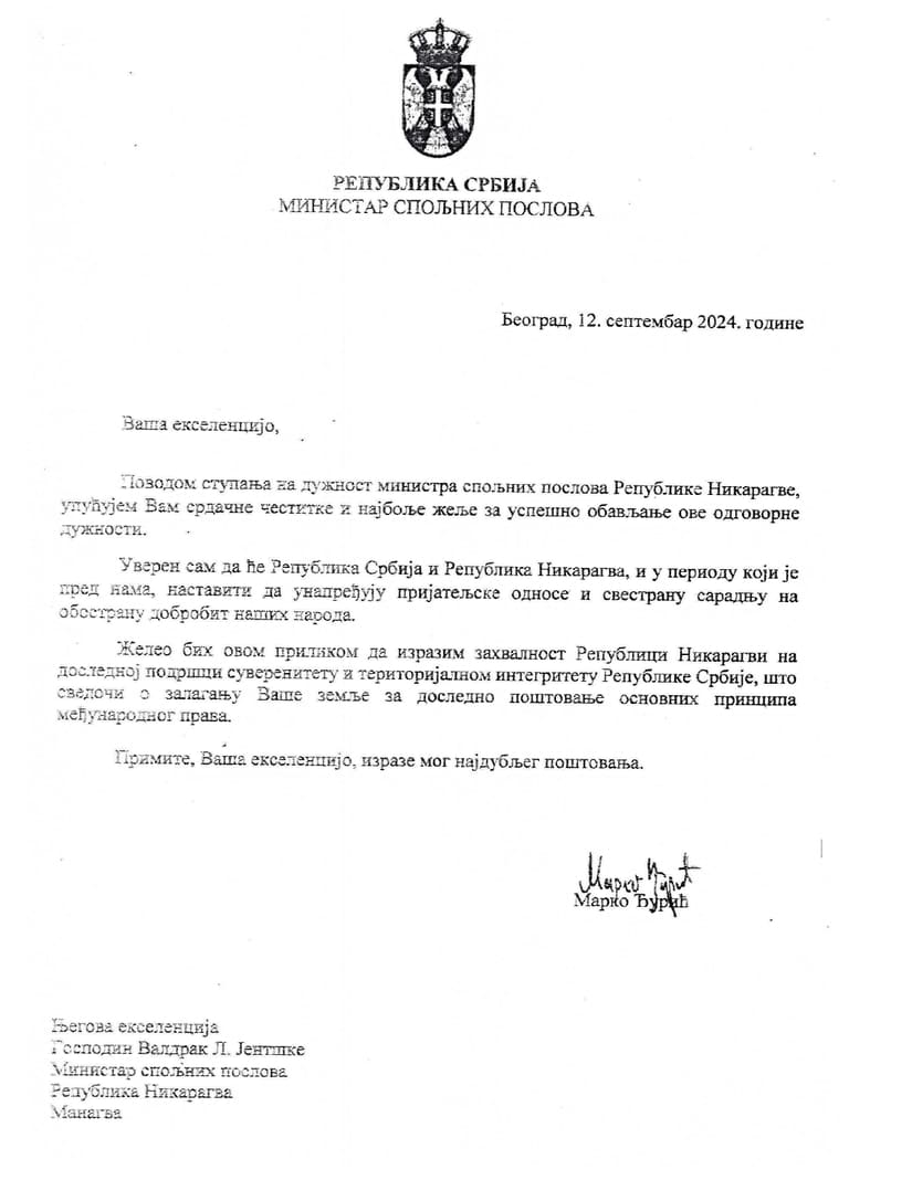 Mensaje de Felicitación del Hermano Marko Djuric, Ministro de Asuntos Exteriores de la República de Serbia, al Compañero Valdrack Jaentschke, por su Nombramiento como Ministro de Relaciones Exteriores de Nicaragua.