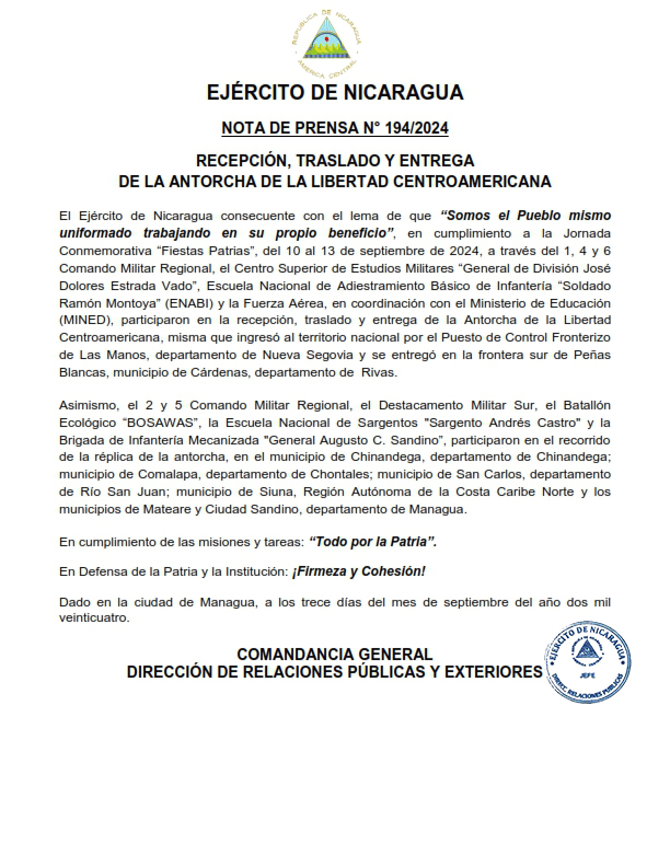 El Ejército de Nicaragua consecuente con el lema de que “Somos el Pueblo mismo uniformado trabajando en su propio beneficio”, en cumplimiento a la Jornada Conmemorativa “Fiestas Patrias”, del 10 al 13 de septiembre de 2024, a través del 1, 4 y 6 Comando Militar Regional, el Centro Superior de Estudios Militares “General de División José Dolores Estrada Vado”, Escuela Nacional de Adiestramiento Básico de Infantería “Soldado Ramón Montoya” (ENABI) y la Fuerza Aérea, en coordinación con el Ministerio de Educación (MINED), participaron en la recepción, traslado y entrega de la Antorcha de la Libertad Centroamericana, misma que ingresó al territorio nacional por el Puesto de Control Fronterizo de Las Manos, departamento de Nueva Segovia y se entregó en la frontera sur de Peñas Blancas, municipio de Cárdenas, departamento de Rivas.