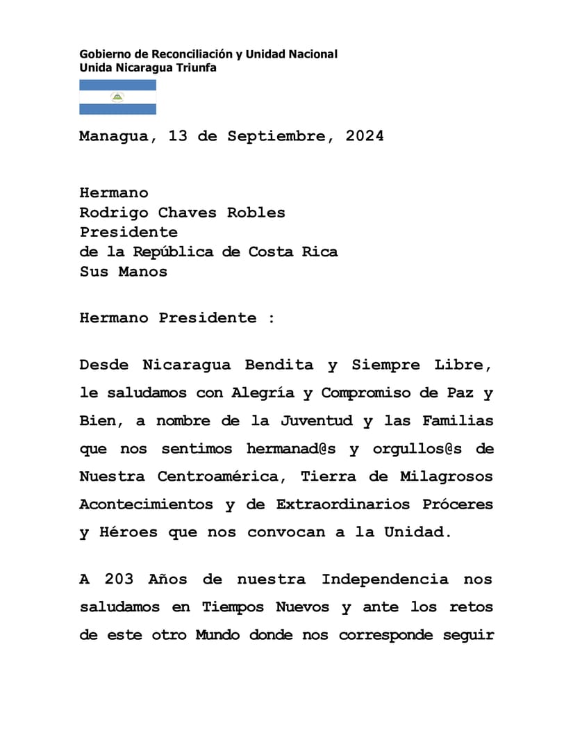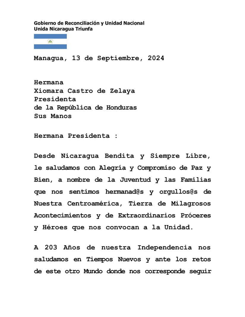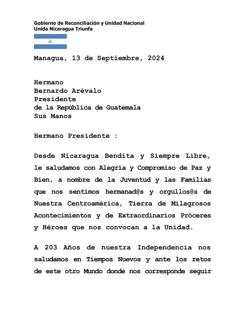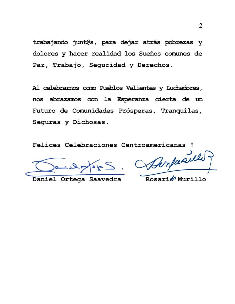 Saludo Fraternal de nuestro Pueblo y Gobierno, y de la Presidencia de la República, a los Hermanos Presidentes de Guatemala, El Salvador, Honduras, y Costa Rica, compartiendo los Festejos de la Independencia de nuestra Centroamérica.