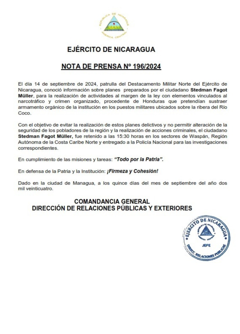 El día 14 de septiembre de 2024, patrulla del Destacamento Militar Norte del Ejército de Nicaragua, conoció información sobre planes preparados por el ciudadano Stedman Fagot Müller, para la realización de actividades al margen de la ley con elementos vinculados al narcotráfico y crimen organizado, procedente de Honduras que pretendían sustraer armamento orgánico de la institución en los puestos militares ubicados sobre la ribera del Río Coco.