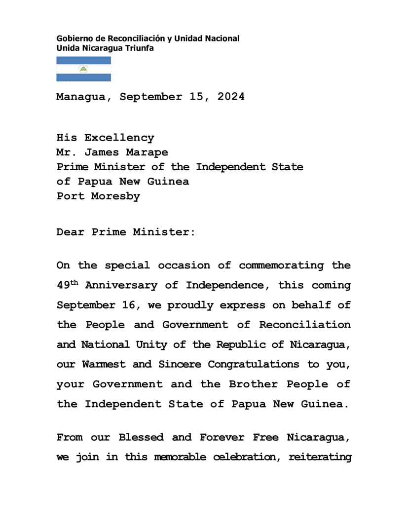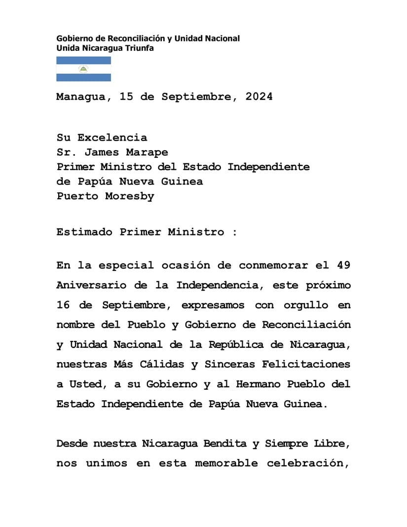 En la especial ocasión de conmemorar el 49 Aniversario de la Independencia, este próximo 16 de Septiembre, expresamos con orgullo en nombre del Pueblo y Gobierno de Reconciliación y Unidad Nacional de la República de Nicaragua, nuestras Más Cálidas y Sinceras Felicitaciones a Usted, a su Gobierno y al Hermano Pueblo del Estado Independiente de Papúa Nueva Guinea.