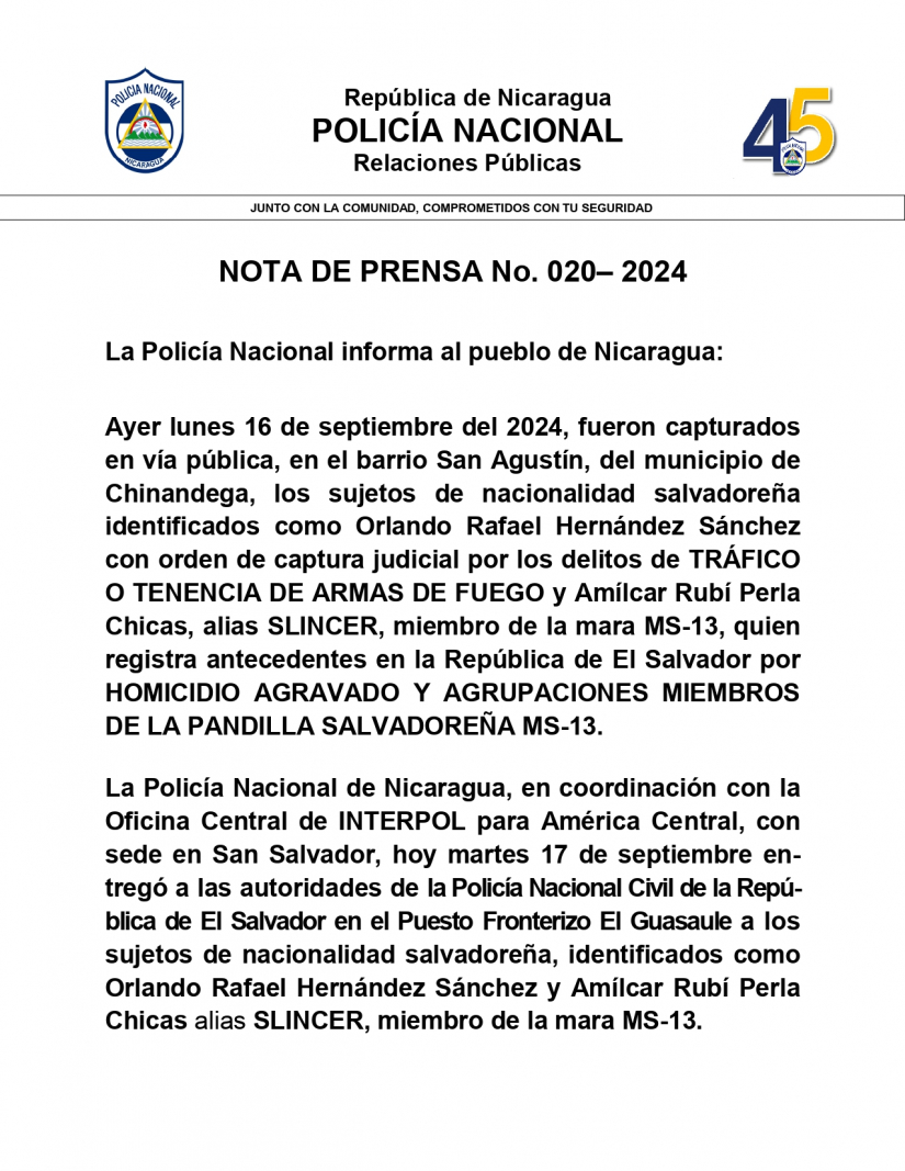La Policía Nacional de Nicaragua, en coordinación con la Oficina Central de INTERPOL para América Central, con sede en San Salvador, hoy martes 17 de septiembre en- tregó a las autoridades de la Policía Nacional Civil de la Repú- blica de El Salvador en el Puesto Fronterizo El Guasaule a los sujetos de nacionalidad salvadoreña, identificados como Orlando Rafael Hernández Sánchez y Amílcar Rubí Perla Chicas alias SLINCER, miembro de la mara MS-13.