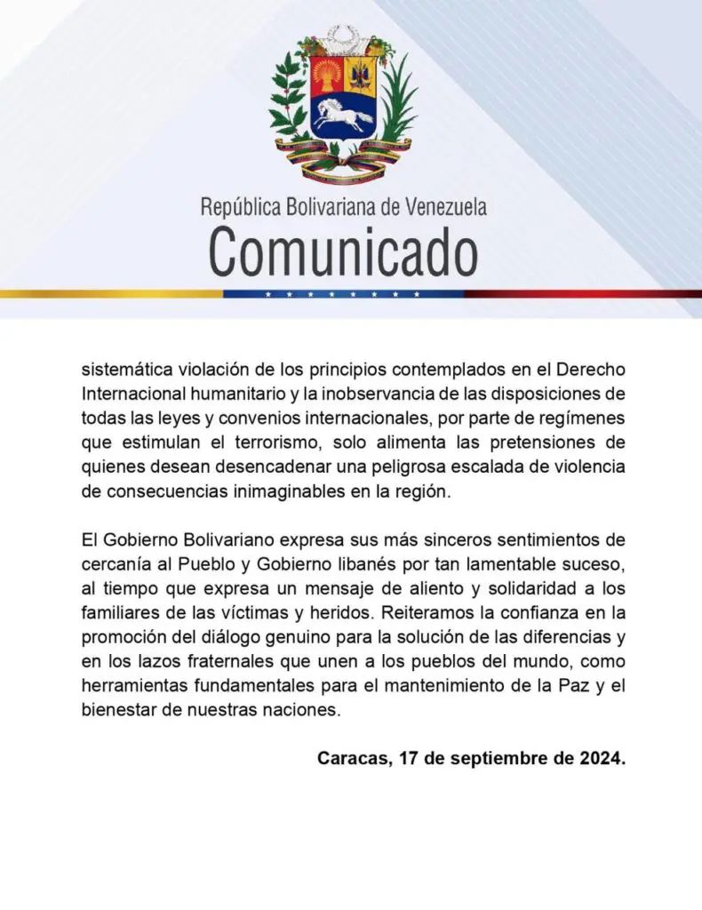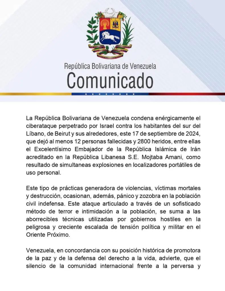 En un comunicado oficial, el Gobierno venezolano apunta se oponen “enérgicamente el ciberataque perpetrado por Israel contra los habitantes del sur del Líbano, de Beirut y sus alrededores, este 17 de septiembre de 2024, que dejó al menos 12 personas fallecidas y 2.800 heridos”.