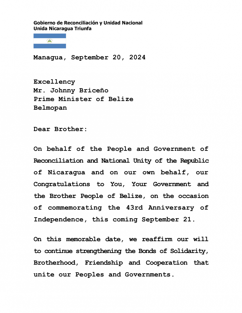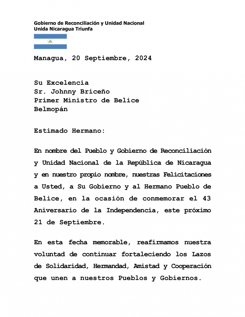 En nombre del Pueblo y Gobierno de Reconciliación y Unidad Nacional de la República de Nicaragua y en nuestro propio nombre, nuestras Felicitaciones a Usted, a Su Gobierno y al Hermano Pueblo de Belice, en la ocasión de conmemorar el 43 Aniversario de la Independencia, este próximo 21 de Septiembre.