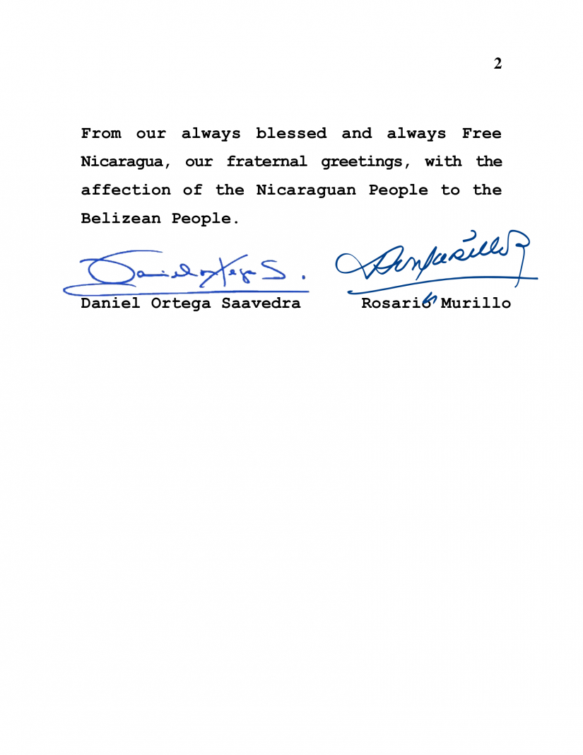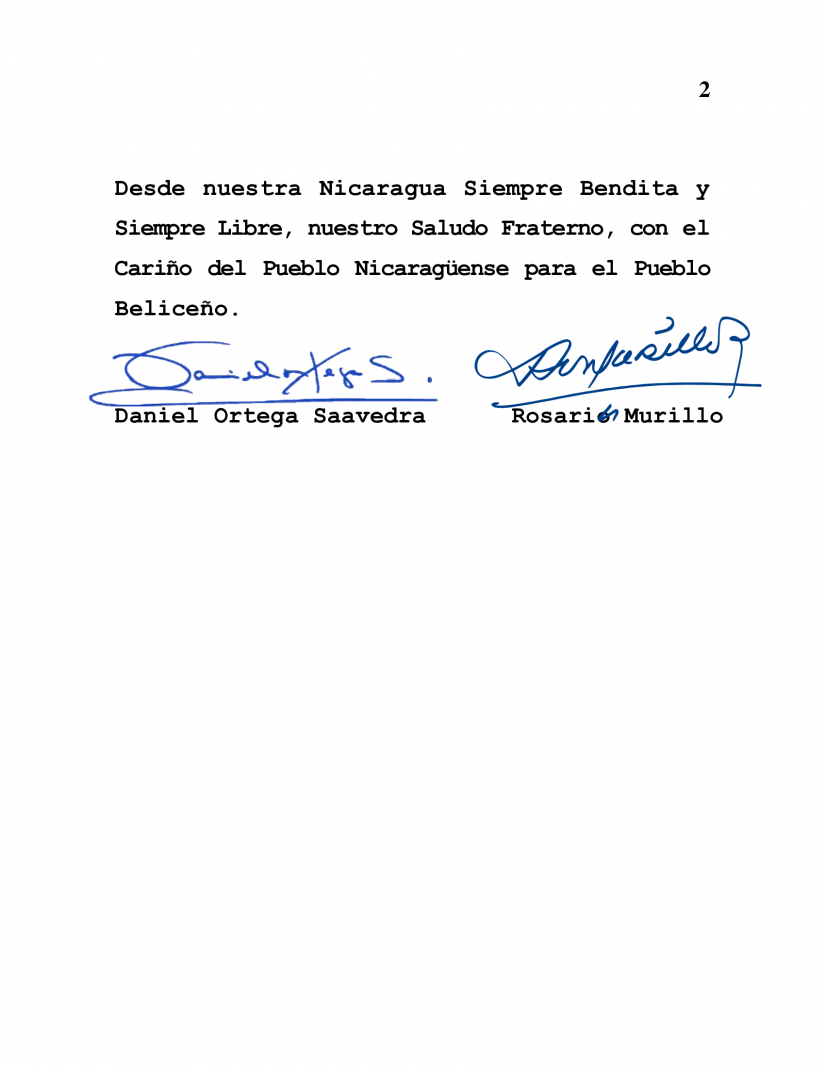 From our always blessed and always Free Nicaragua, our fraternal greetings, with the affection of the Nicaraguan People to the Belizean People.