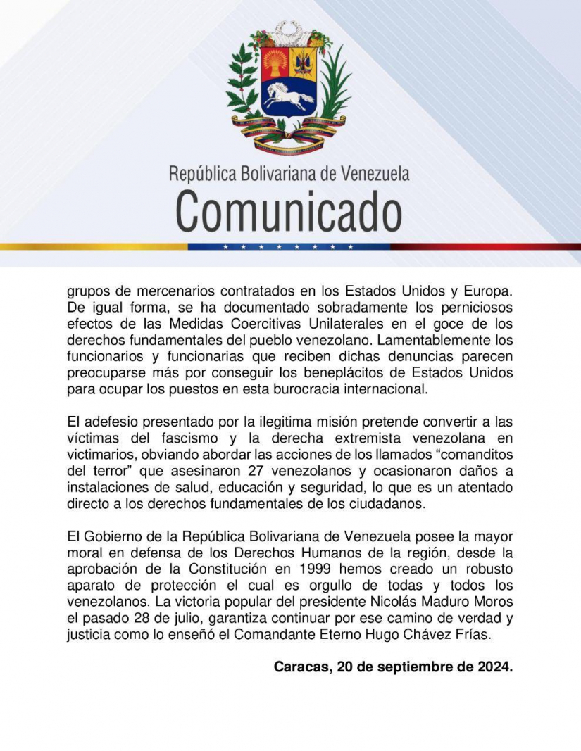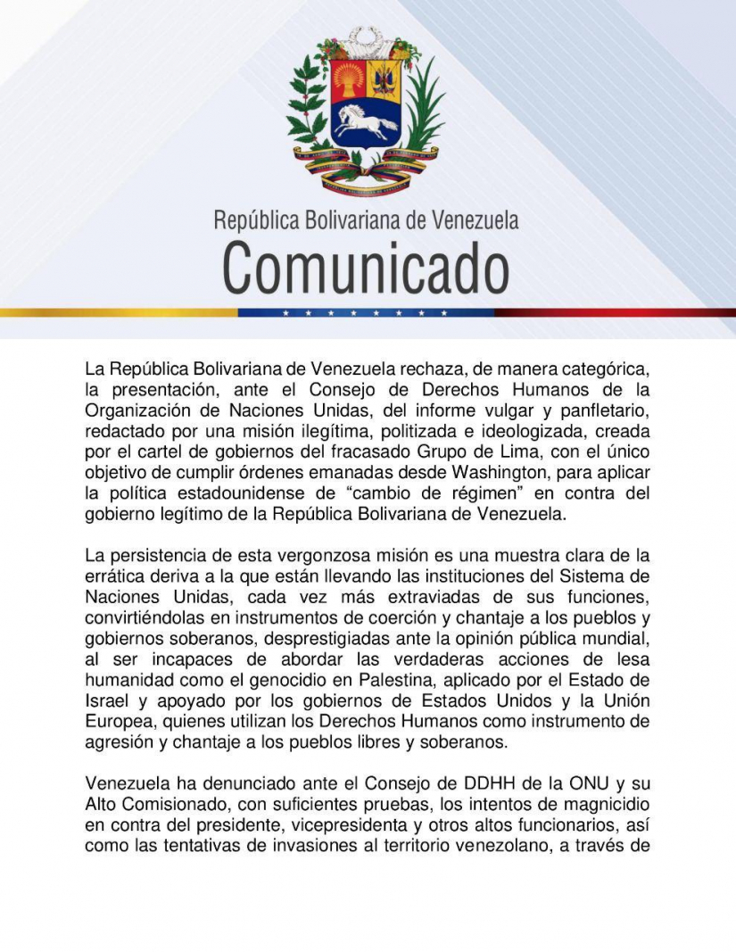 Comunicado del Gobierno Bolivariano condena presentación de informe en el Consejo de DDHH de Naciones Unidas.