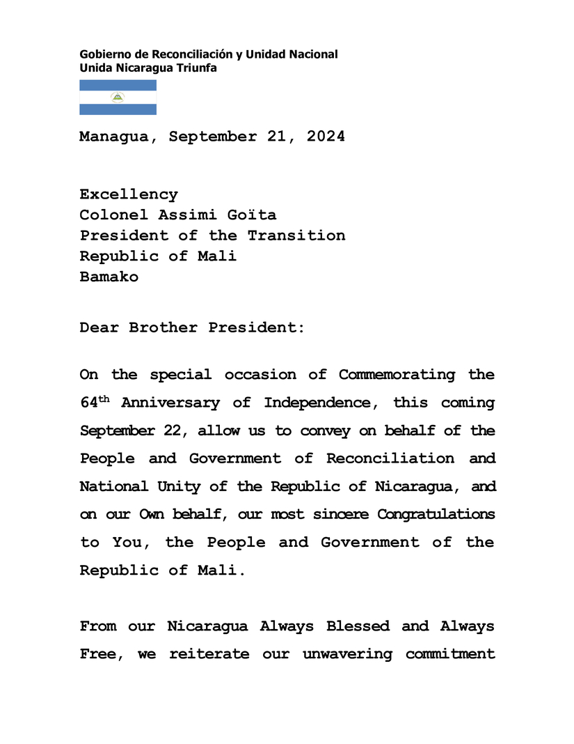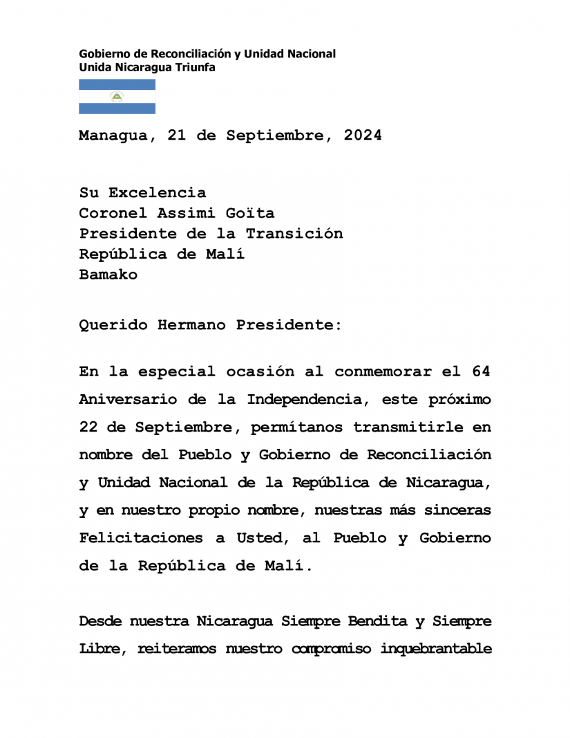 En la especial ocasión al conmemorar el 64 Aniversario de la Independencia, este próximo 22 de Septiembre, permítanos transmitirle en nombre del Pueblo y Gobierno de Reconciliación y Unidad Nacional de la República de Nicaragua, y en nuestro propio nombre, nuestras más sinceras Felicitaciones a Usted, al Pueblo y Gobierno de la República de Malí.