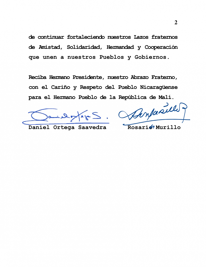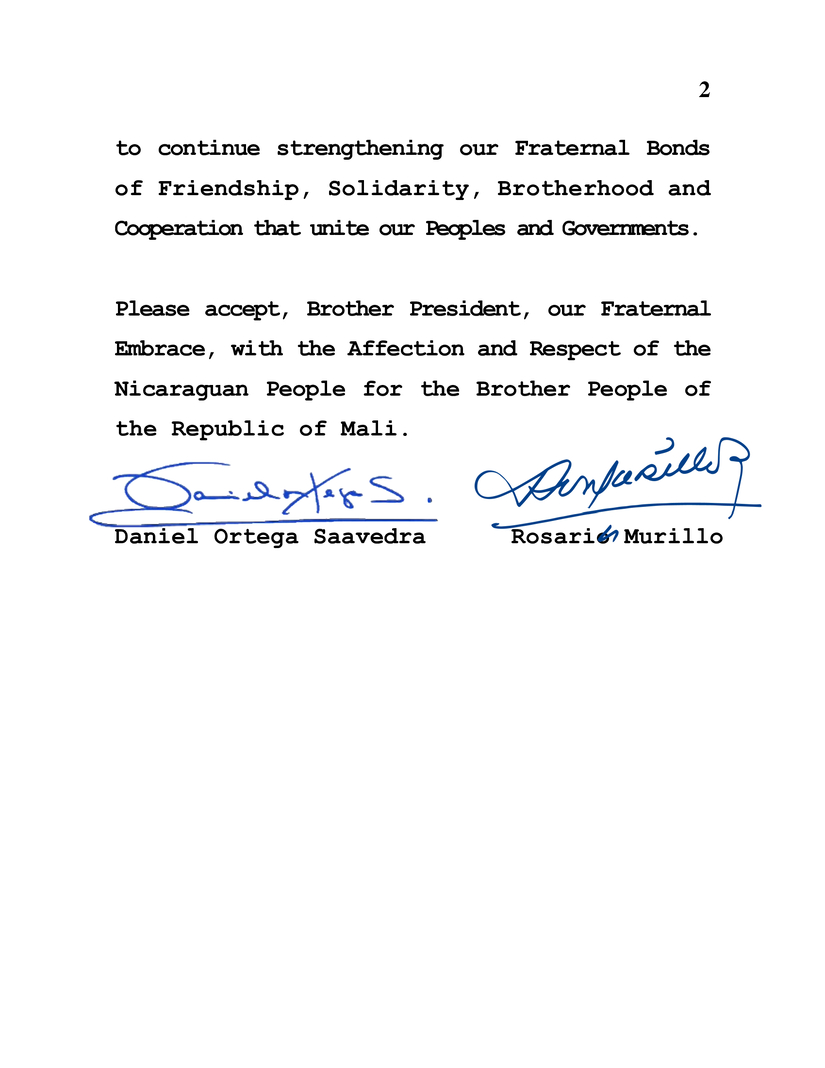Please accept, Brother President, our Fraternal Embrace, with the Affection and Respect of the Nicaraguan People for the Brother People of the Republic of Mali.