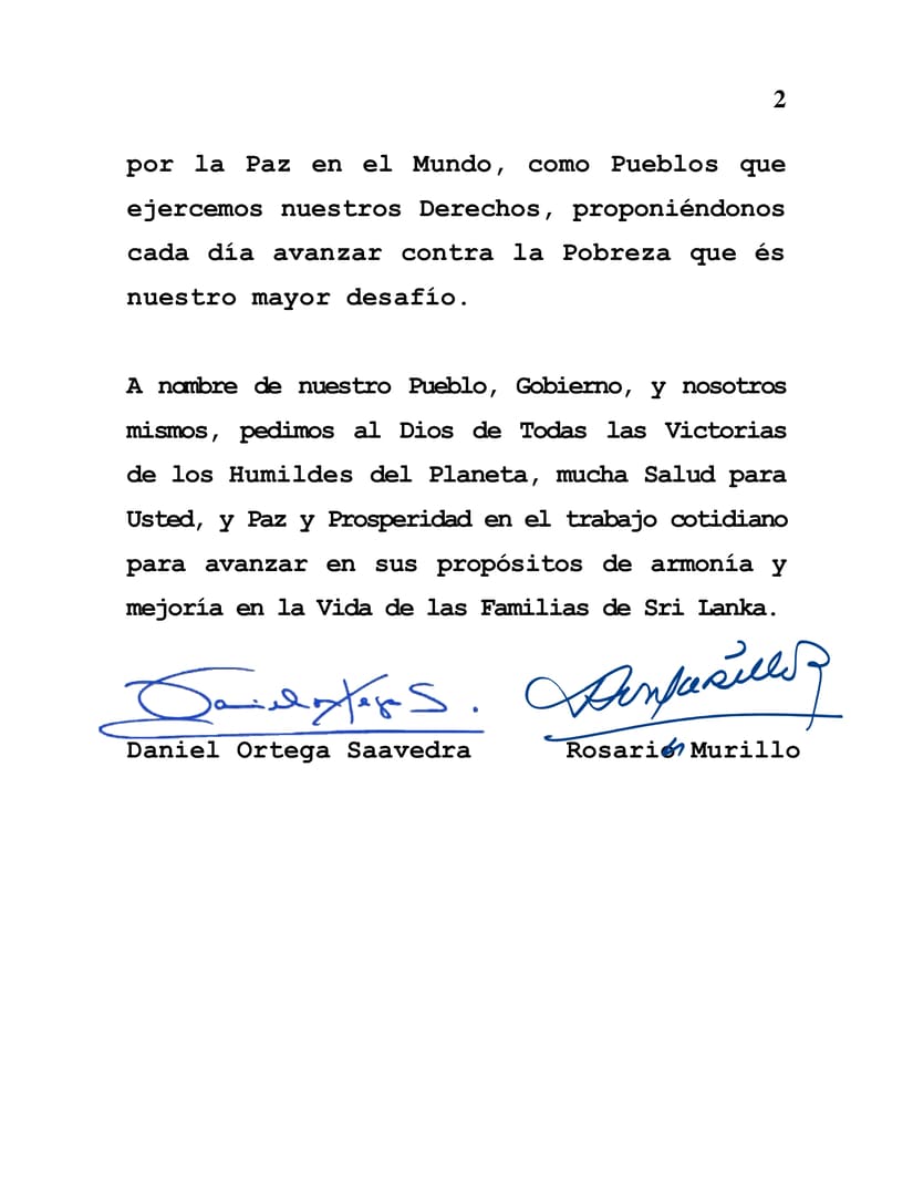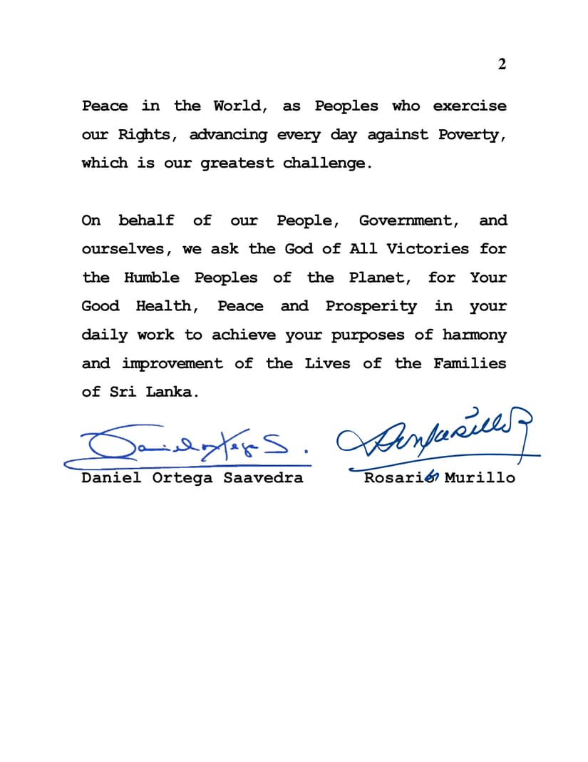 A nombre de nuestro Pueblo, Gobierno, y nosotros mismos, pedimos al Dios de Todas las Victorias de los Humildes del Planeta, mucha Salud para Usted, y Paz y Prosperidad en el trabajo cotidiano para avanzar en sus propósitos de armonía y mejoría en la Vida de las Familias de Sri Lanka.