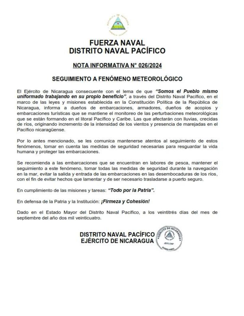 El Ejército de Nicaragua consecuente con el lema de que "Somos el Pueblo mismo uniformado trabajando en su propio beneficio", a través del Distrito Naval Pacífico, en el marco de las leyes y misiones establecida en la Constitución Política de la República de Nicaragua, informa a dueños de embarcaciones, armadores, dueños de acopios y embarcaciones turísticas que se mantiene el monitoreo de las perturbaciones meteorológicas que se están formando en el litoral Pacifico y Caribe. Las que afectarán con lluvias, crecidas de ríos, originando incremento de la intensidad de los vientos y presencia de marejadas en el Pacifico nicaragüense.