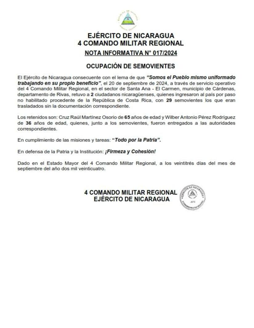 El Ejército de Nicaragua consecuente con el lema de que "Somos el Pueblo mismo uniformado trabajando en su propio beneficio", el 20 de septiembre de 2024, a través de servicio operativo del 4 Comando Militar Regional, en el sector de Santa Ana - El Carmen, municipio de Cárdenas, departamento de Rivas, retuvo a 2 ciudadanos nicaragüenses, quienes ingresaron al país por paso no habilitado procedente de la República de Costa Rica, con 29 semovientes los que eran trasladados sin la documentación correspondiente.