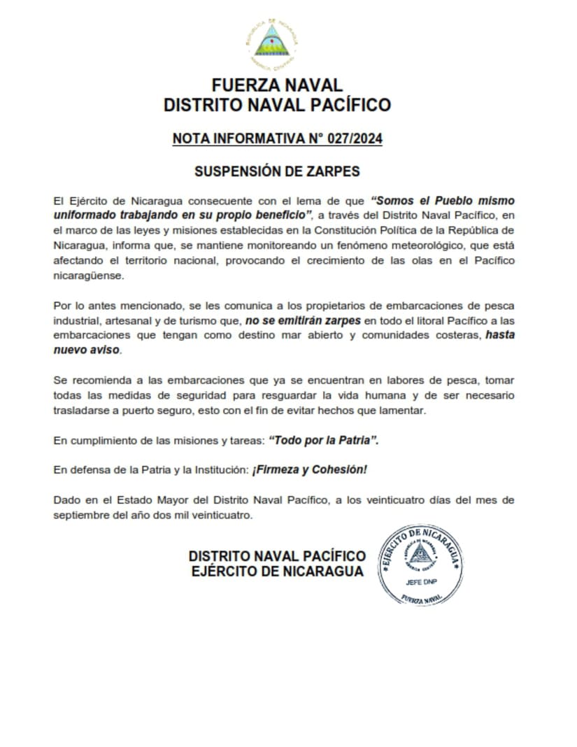 El Ejército de Nicaragua consecuente con el lema de que “Somos el Pueblo mismo uniformado trabajando en su propio beneficio”, a través del Distrito Naval Pacífico, en el marco de las leyes y misiones establecidas en la Constitución Política de la República de Nicaragua, informa que, se mantiene monitoreando un fenómeno meteorológico, que está afectando el territorio nacional, provocando el crecimiento de las olas en el Pacífico nicaragüense.