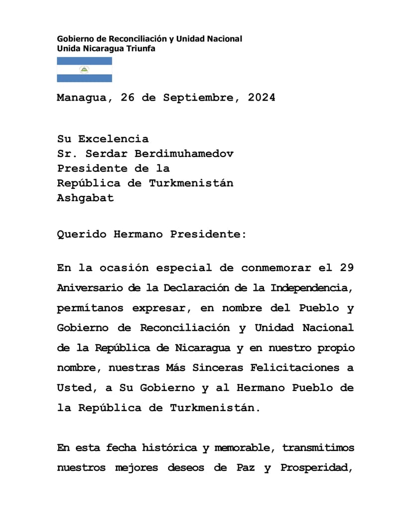 En la ocasión especial de conmemorar el 29 Aniversario de la Declaración de la Independencia, permítanos expresar, en nombre del Pueblo y Gobierno de Reconciliación y Unidad Nacional de la República de Nicaragua y en nuestro propio nombre, nuestras Más Sinceras Felicitaciones a Usted, a Su Gobierno y al Hermano Pueblo de la República de Turkmenistán.