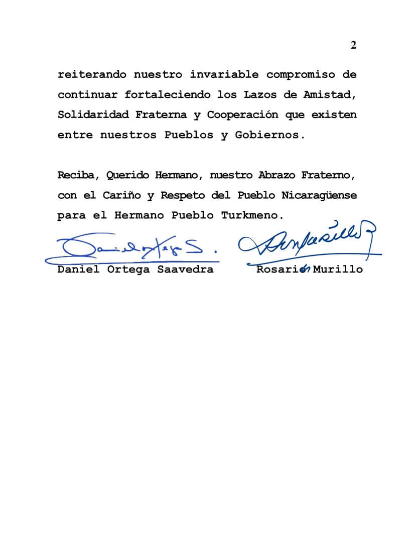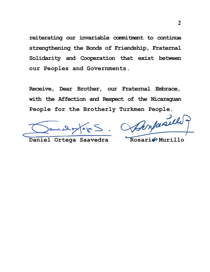 Receive, Dear Brother, our Fraternal Embrace, with the Affection and Respect of the Nicaraguan People for the Brotherly Turkmen People.