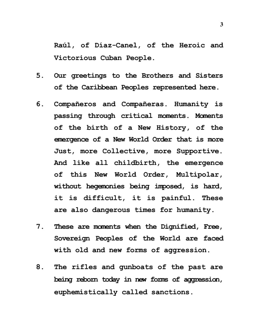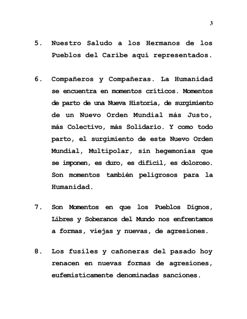 6. Compañeros and Compañeras. Humanity is passing through critical moments. Moments of the birth of a New History, of the emergence of a New World Order that is more Just, more Collective, more Supportive. And like all childbirth, the emergence of this New World Order, Multipolar, without hegemonies being imposed, is hard, it is difficult, it is painful. These are also dangerous times for humanity.