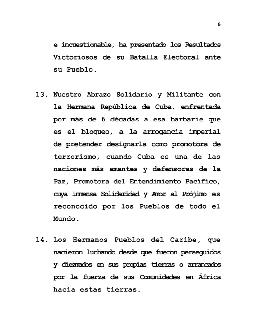 13. Nuestro Abrazo Solidario y Militante con la Hermana República de Cuba, enfrentada por más de 6 décadas a esa barbarie que es el bloqueo, a la arrogancia imperial de pretender designarla como promotora de terrorismo, cuando Cuba es una de las naciones más amantes y defensoras de la Paz, Promotora del Entendimiento Pacífico, cuya inmensa Solidaridad y Amor al Prójimo es reconocido por los Pueblos de todo el Mundo.