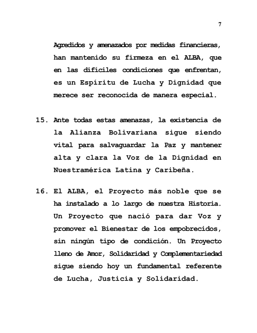 15. Ante todas estas amenazas, la existencia de la Alianza Bolivariana sigue siendo vital para salvaguardar la Paz y mantener alta y clara la Voz de la Dignidad en Nuestramérica Latina y Caribeña.
