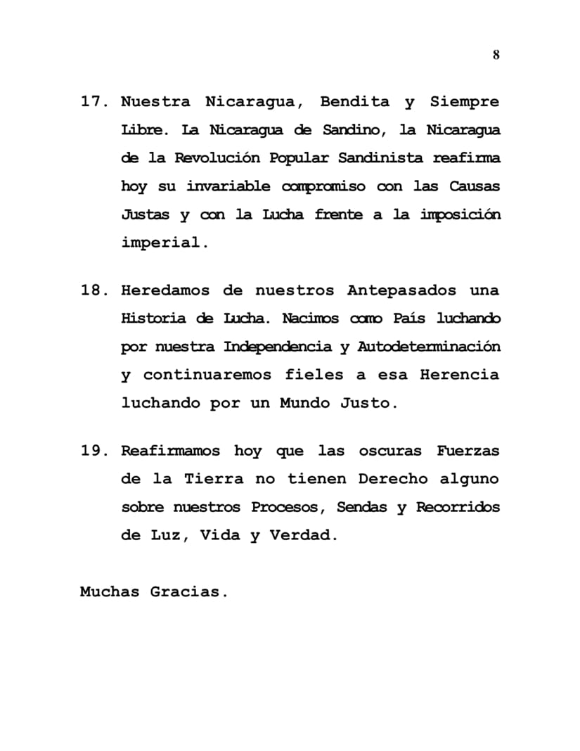 17. Our Nicaragua, Blessed and Forever Free. The Nicaragua of Sandino, the Nicaragua of the Sandinista Popular Revolution, reaffirms today its unchanging commitment to Just Causes and to the Struggle against imperial impositions.