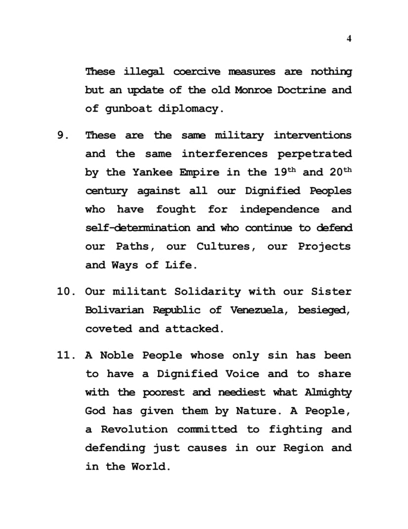 4. Our greeting to the Always Combative, Steadfast and Solidarity inspired Sister Republic of Cuba. The Cuba of Fidel, of Raúl, of Díaz-Canel, of the Heroic and Victorious Cuban People.
