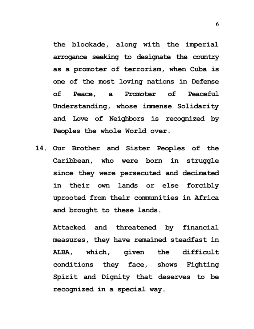 13. Our Solidarity inspired, militant embrace for our Sister Republic of Cuba, confronting over more than six decades the barbarism of the blockade, along with the imperial arrogance seeking to designate the country as a promoter of terrorism, when Cuba is one of the most loving nations in Defense of Peace, a Promoter of Peaceful Understanding, whose immense Solidarity and Love of Neighbors is recognized by Peoples the whole World over.