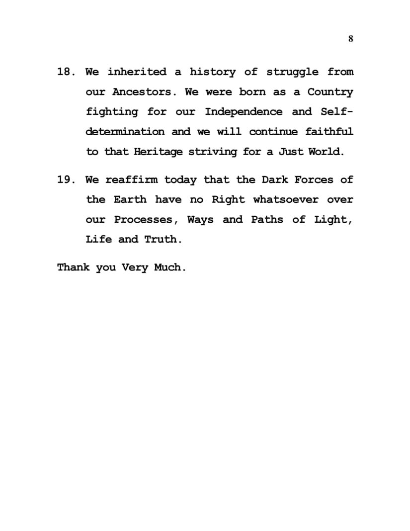 19. We reaffirm today that the Dark Forces of the Earth have no Right whatsoever over our Processes, Ways and Paths of Light, Life and Truth.