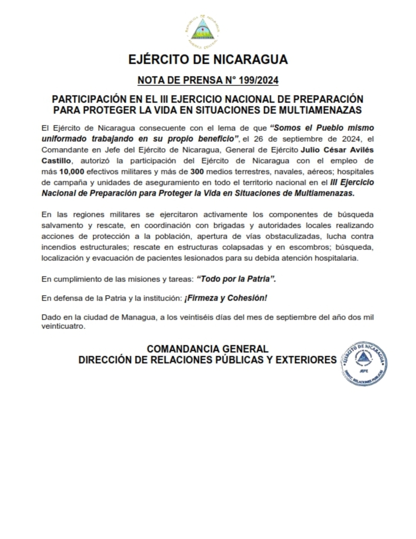 El Ejército de Nicaragua consecuente con el lema de que “Somos el Pueblo mismo uniformado trabajando en su propio beneficio”, el 26 de septiembre de 2024, el Comandante en Jefe del Ejército de Nicaragua, General de Ejército Julio César Avilés Castillo, autorizó la participación del Ejército de Nicaragua con el empleo de más 10,000 efectivos militares y más de 300 medios terrestres, navales, aéreos; hospitales de campaña y unidades de aseguramiento en todo el territorio nacional en el III Ejercicio Nacional de Preparación para Proteger la Vida en Situaciones de Multiamenazas.