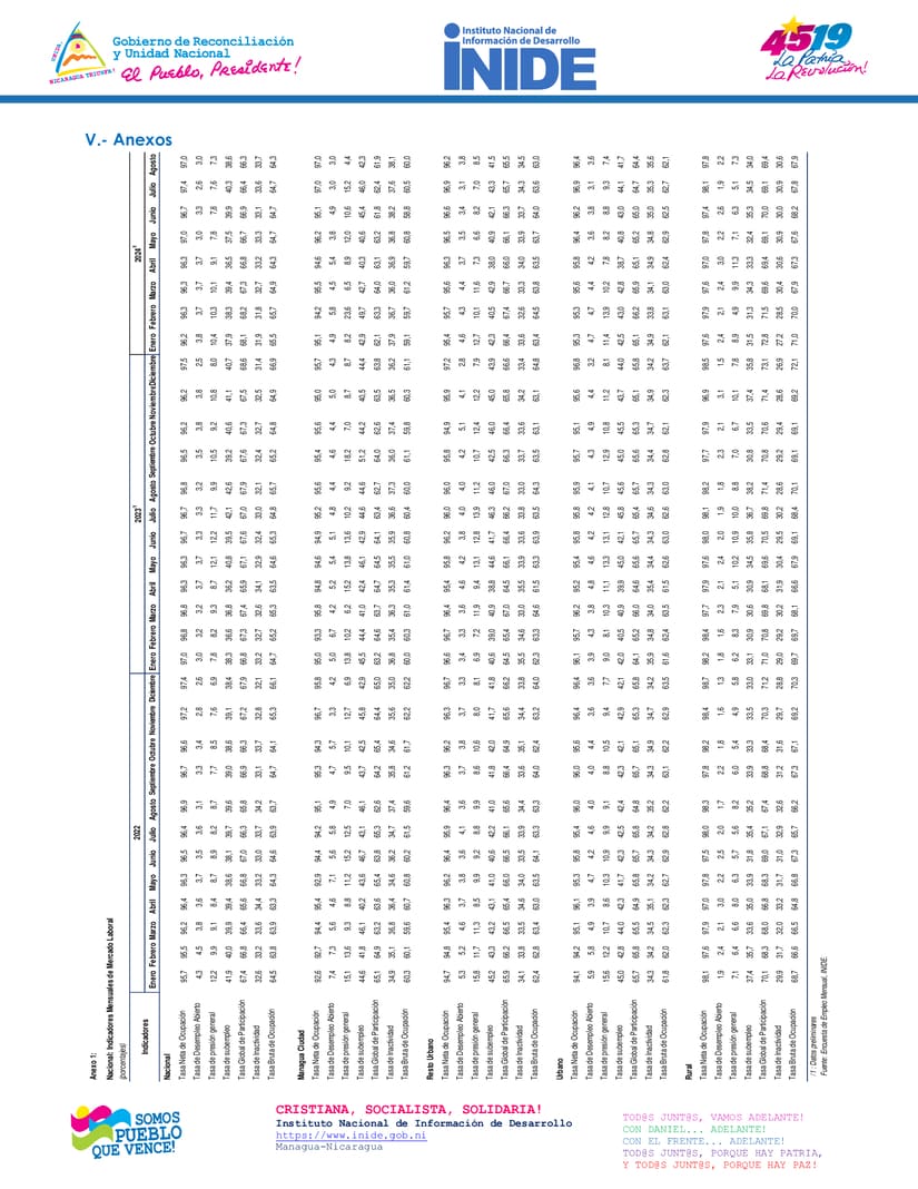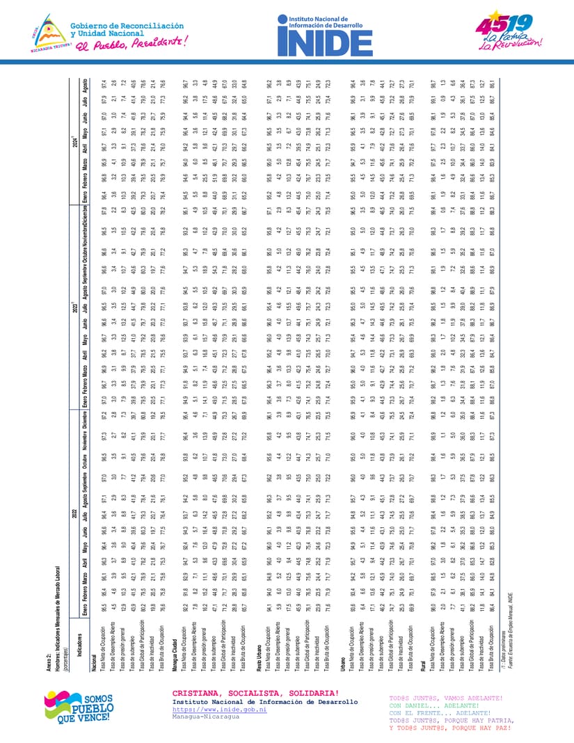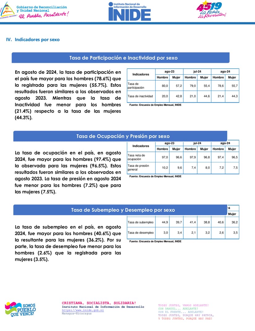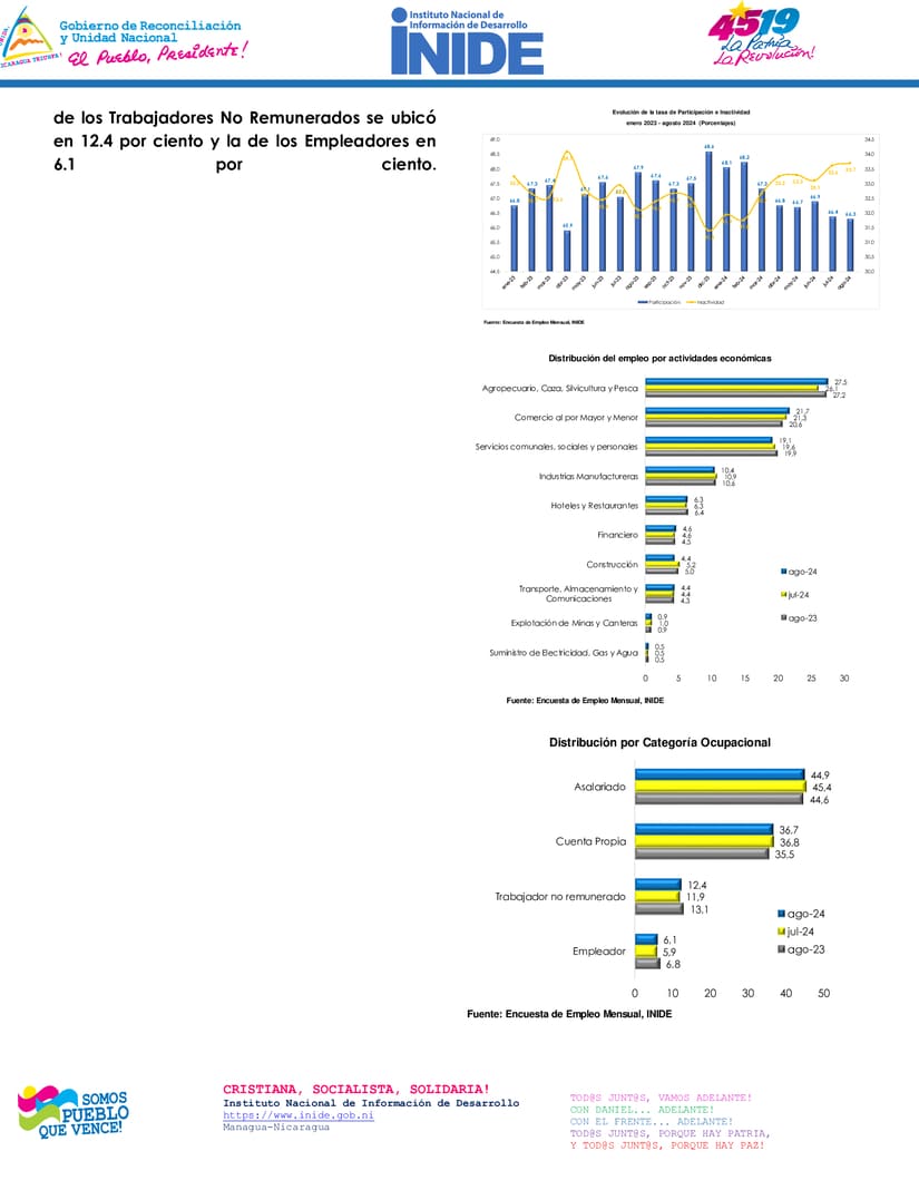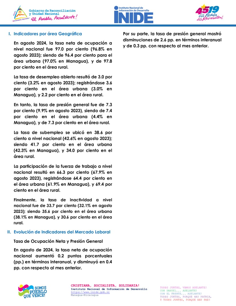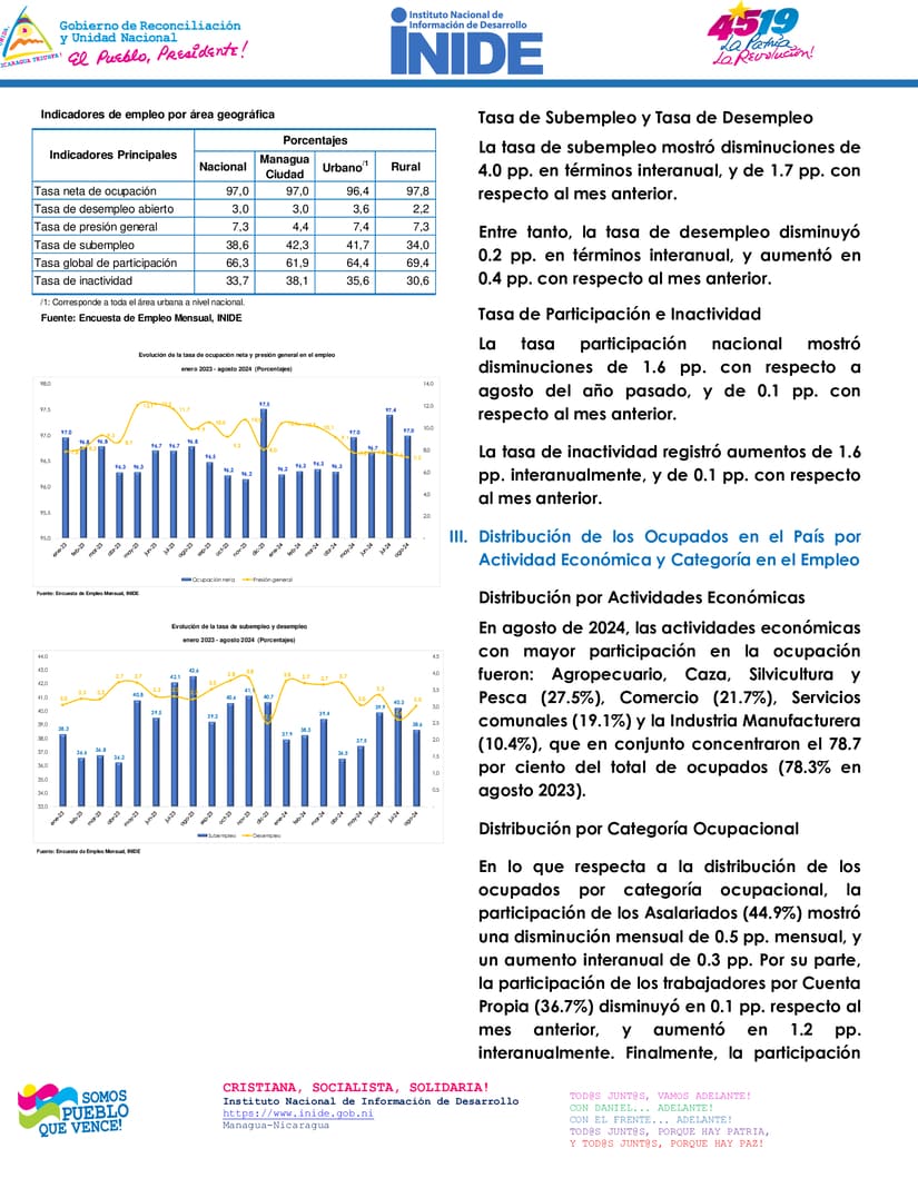 El Instituto Nacional de Información de Desarrollo (INIDE) publicó el día 27 de septiembre de 2024, en su página web, los resultados de la Encuesta de Empleo Mensual del mes de agosto de 2024, destacándose lo siguiente: