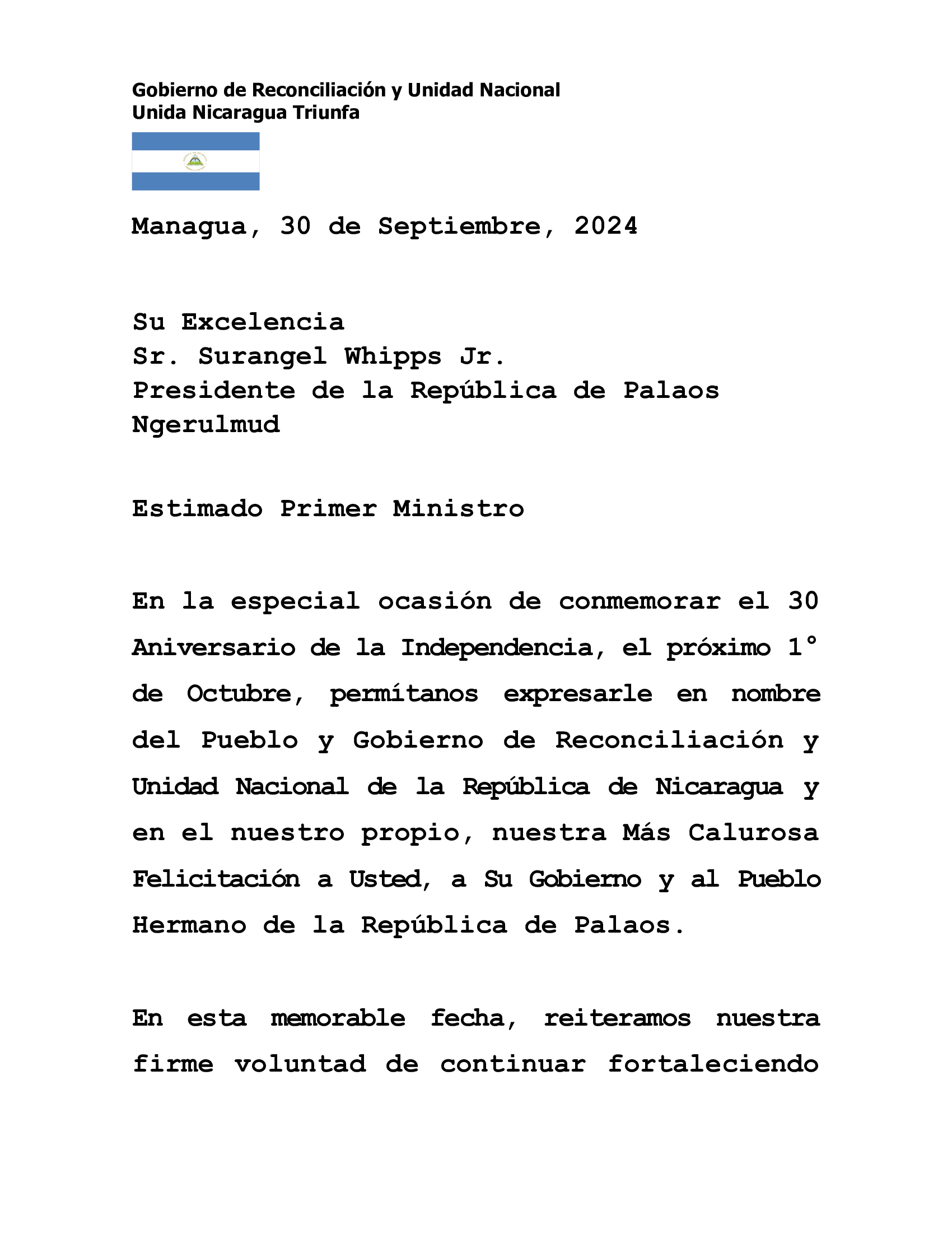 En la especial ocasión de conmemorar el 30 Aniversario de la Independencia, el próximo 1° de Octubre, permítanos expresarle en nombre del Pueblo y Gobierno de Reconciliación y Unidad Nacional de la República de Nicaragua y en el nuestro propio, nuestra Más Calurosa Felicitación a Usted, a Su Gobierno y al Pueblo Hermano de la República de Palaos.