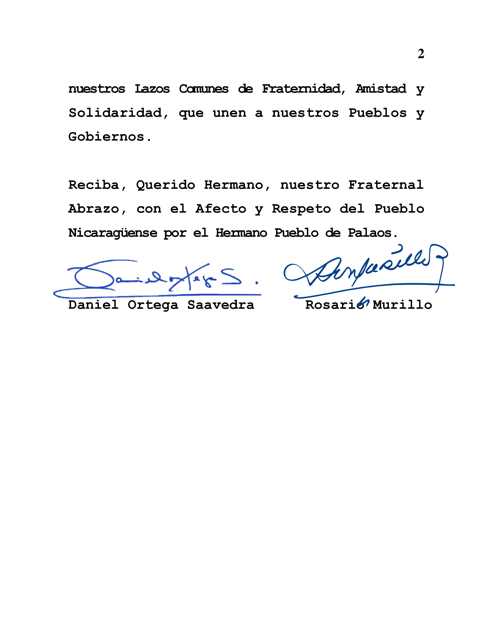 Reciba, Querido Hermano, nuestro Fraternal Abrazo, con el Afecto y Respeto del Pueblo Nicaragüense por el Hermano Pueblo de Palaos.