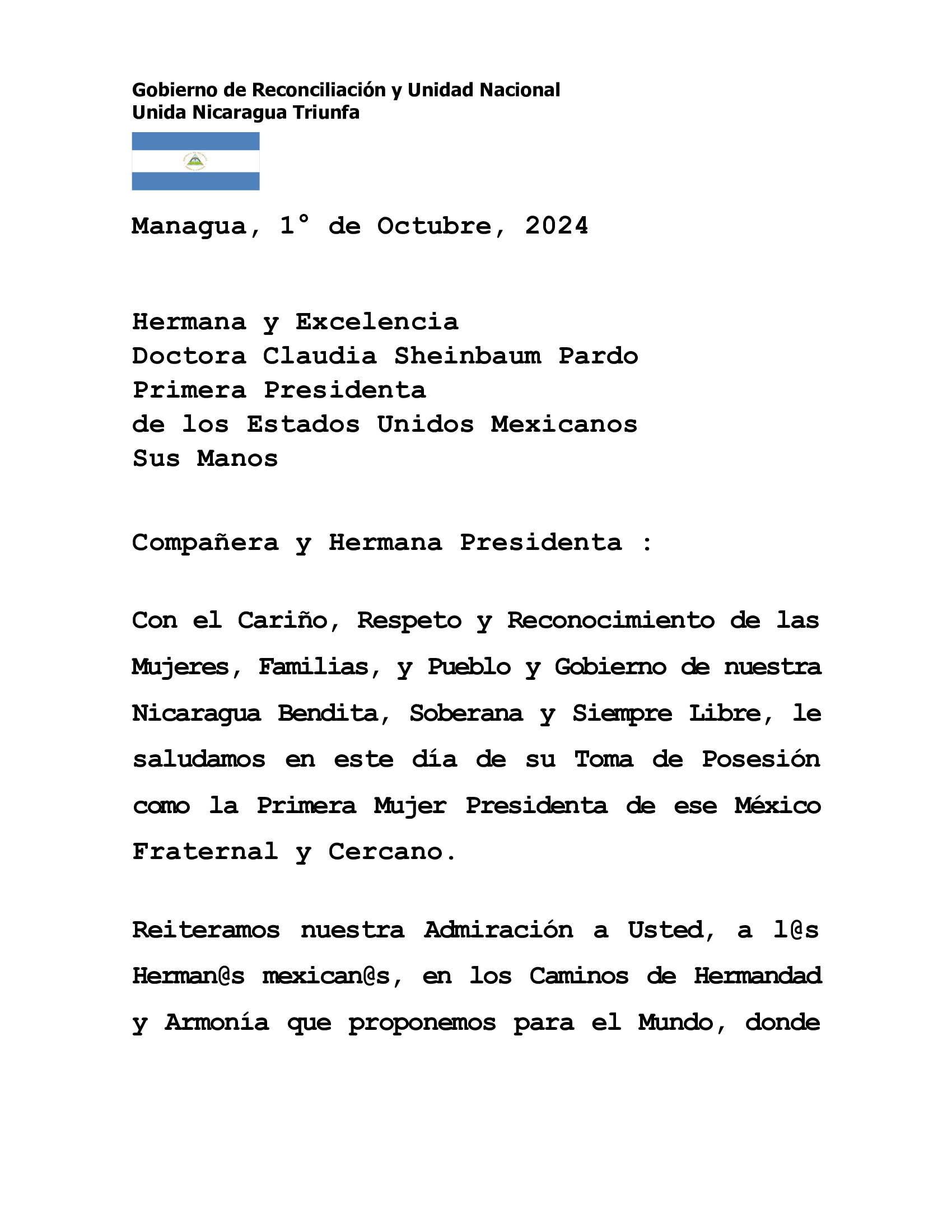 Con el Cariño, Respeto y Reconocimiento de las Mujeres, Familias, y Pueblo y Gobierno de nuestra Nicaragua Bendita, Soberana y Siempre Libre, le saludamos en este día de su Toma de Posesión como la Primera Mujer Presidenta de ese México Fraternal y Cercano.