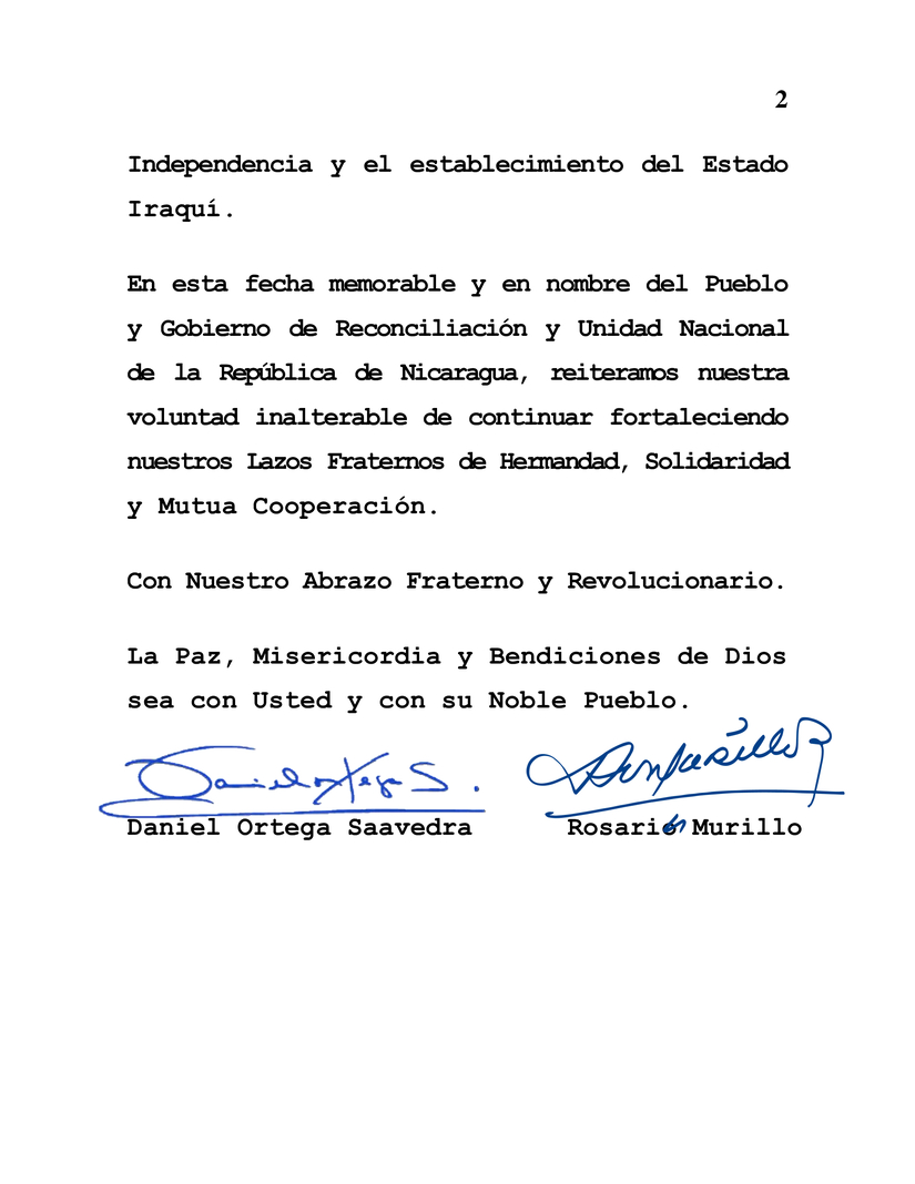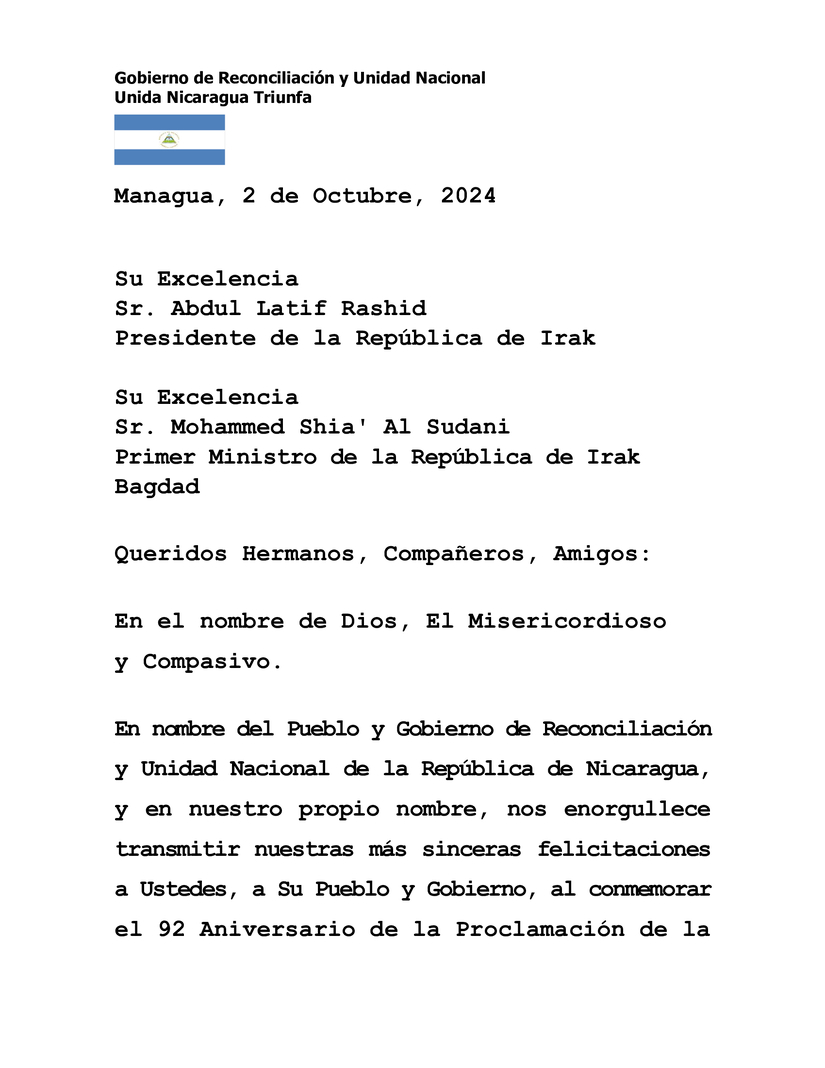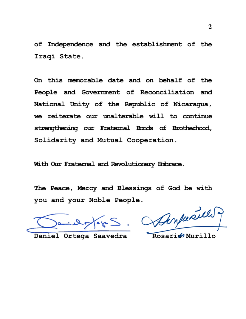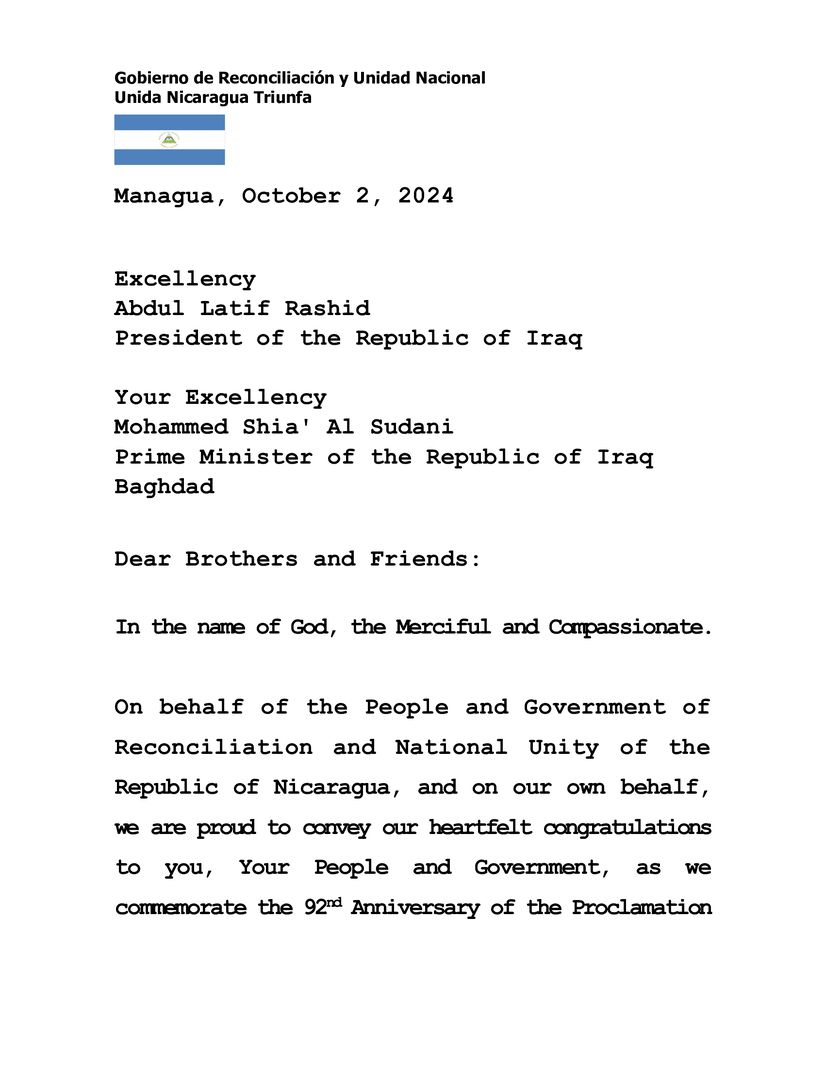 En nombre del Pueblo y Gobierno de Reconciliación y Unidad Nacional de la República de Nicaragua, y en nuestro propio nombre, nos enorgullece transmitir nuestras más sinceras felicitaciones a Ustedes, a Su Pueblo y Gobierno, al conmemorar el 92 Aniversario de la Proclamación de la Independencia y el establecimiento del Estado Iraquí.
