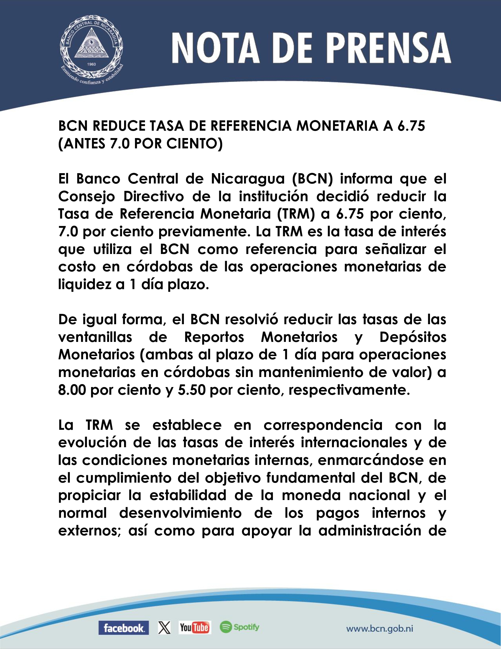 El Banco Central de Nicaragua (BCN) informa que el Consejo Directivo de la institución decidió reducir la Tasa de Referencia Monetaria (TRM) a 6.75 por ciento, 7.0 por ciento previamente. La TRM es la tasa de interés que utiliza el BCN como referencia para señalizar el costo en córdobas de las operaciones monetarias de liquidez a 1 día plazo.