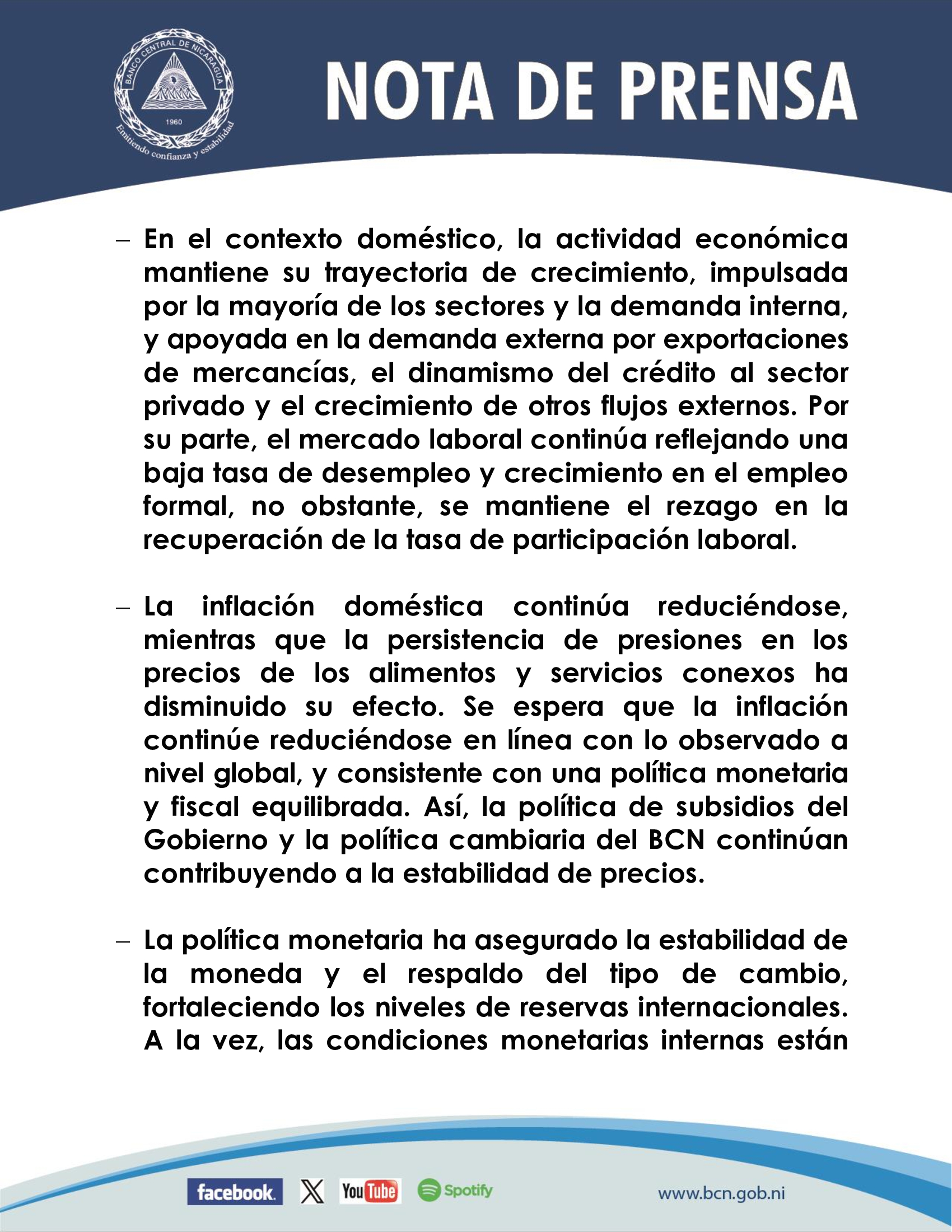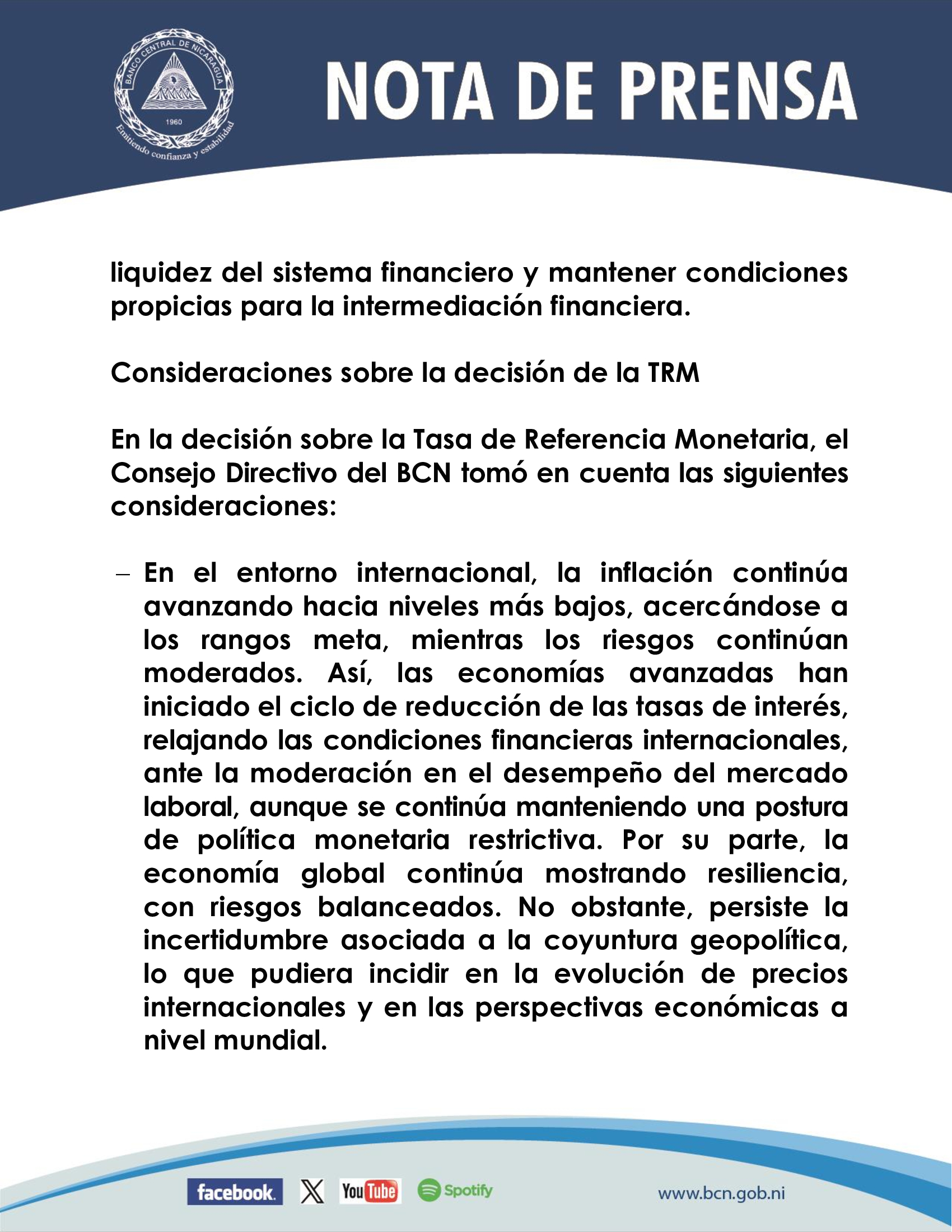 En la decisión sobre la Tasa de Referencia Monetaria, el Consejo Directivo del BCN tomó en cuenta las siguientes consideraciones: