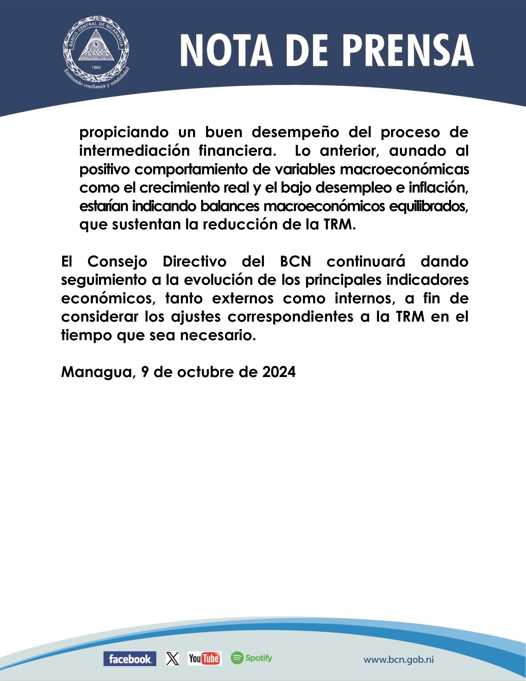 El Consejo Directivo del BCN continuará dando seguimiento a la evolución de los principales indicadores económicos, tanto externos como internos, a fin de considerar los ajustes correspondientes a la TRM en el tiempo que sea necesario.