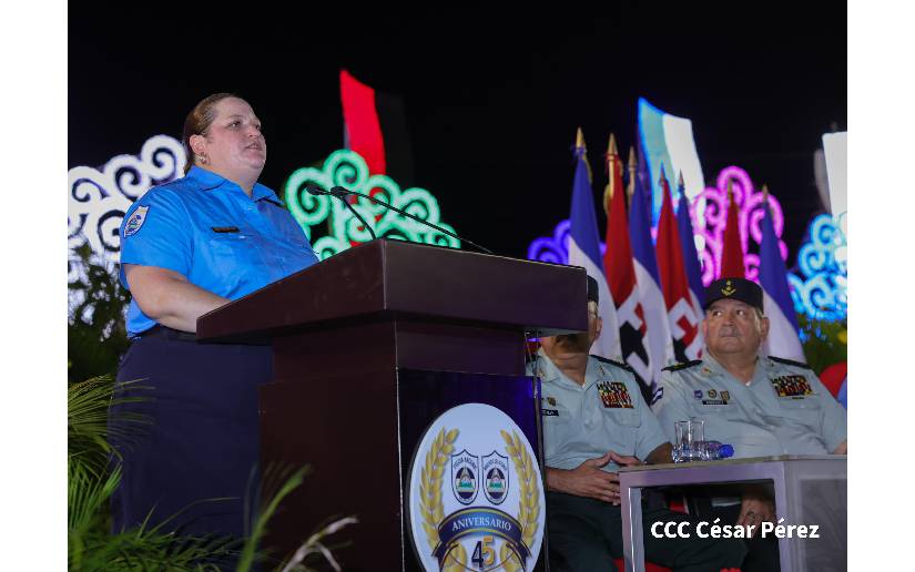 En un emotivo discurso, la Ministra del Interior, María Amelia Coronel Kinloch, destacó que en los 45 años de la fundación del Ministerio del Interior y la Policía Nacional, los avances en seguridad, servicios comunitarios y la cooperación internacional, a su vez reafirmó el compromiso de las instituciones en proteger la tranquilidad, la paz y la seguridad del pueblo nicaragüenses.