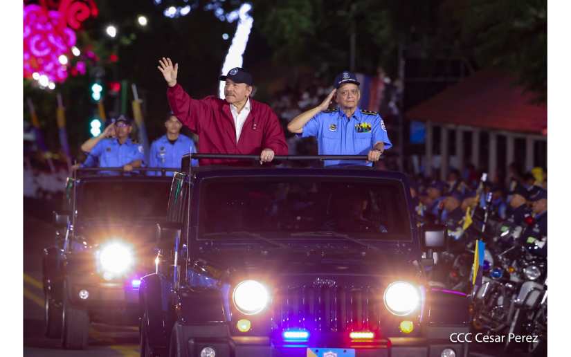 El Presidente de Nicaragua Comandante Daniel Ortega y la Vicepresidenta Compañera Rosario Murillo, participan en el Desfile Policial "La Paz Somos Todos" en saludo al 45 aniversario de fundación del Ministerio del Interior y la Policía Nacional, celebrado en la Avenida de Bolívar a Chávez.