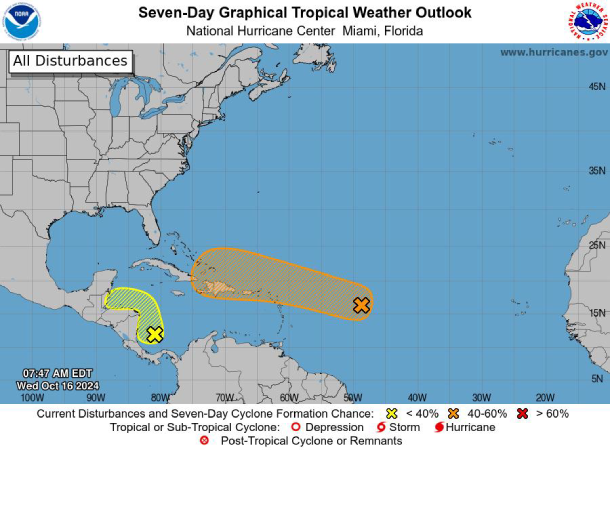 Los últimos análisis muestran que el disturbio atmosférico reportado el día de ayer, se mantiene al oeste del Mar Caribe, (a unos 300 km al sureste de la ciudad de Bluefields), las probabilidades de desarrollo no han variado y continúan en 30 % para los próximos 7 días.