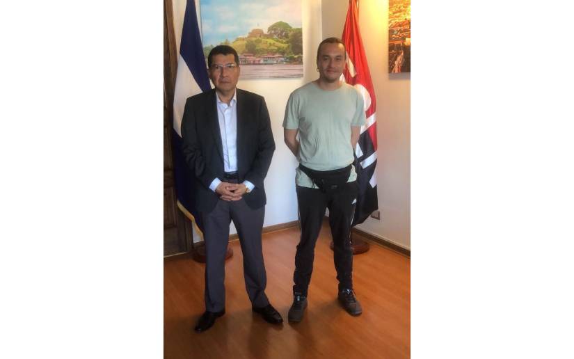 Fue recibido por nuestro Encargado de Negocios, Compañero Carlos Midence, quien luego de saludarlo en nombre de nuestro Buen Gobierno Sandinista y Pueblo, le dio a conocer sobre nuestro Modelo de Desarrollo Revolucionario: sus Logros, Avances, de las Luchas de nuestra Nicaragua Sandinista y, acerca de los atractivos turísticos de nuestra Patria.