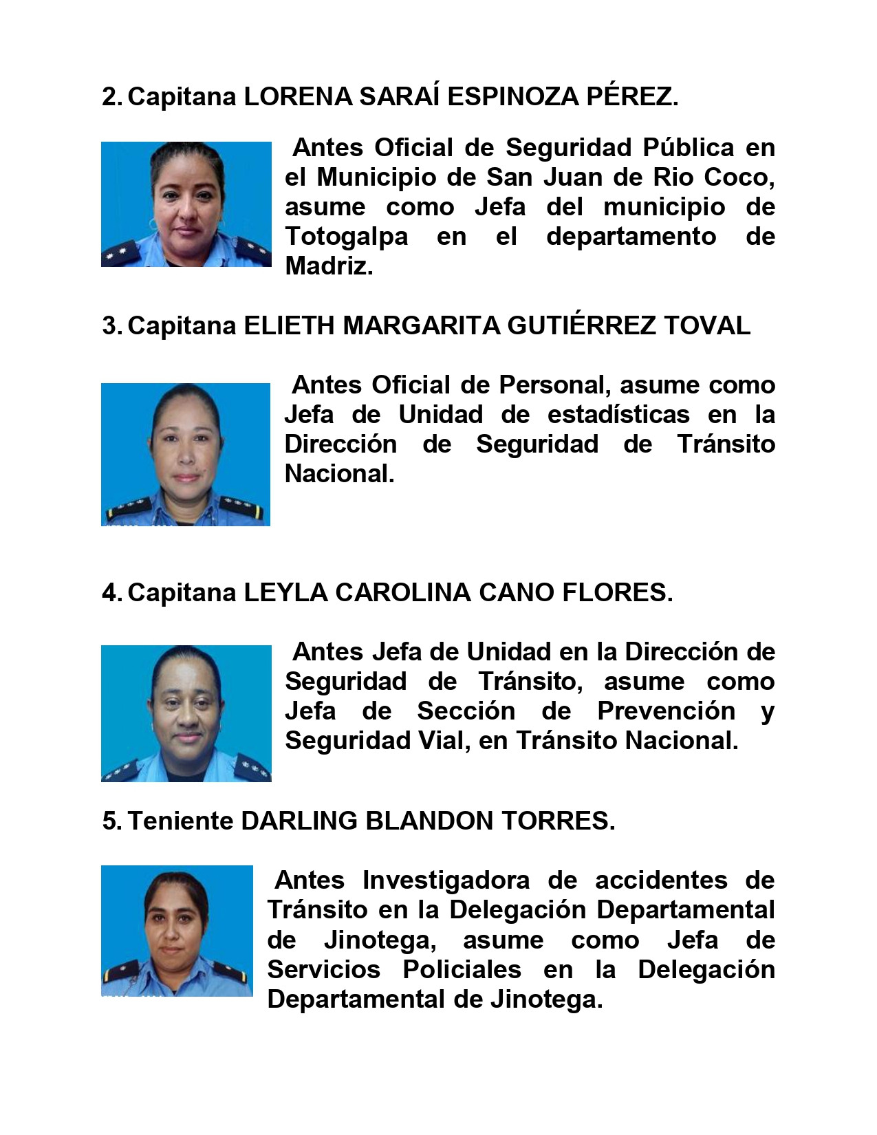 La Policía Nacional, en reconocimiento al liderazgo y capacidades de nuestras Compañeras Policías que trabajan por la Paz y la Seguridad de las familias nicaragüenses, conforme a lo dispuesto en la ley No. 872, Ley de la Policía Nacional, ha realizado los siguientes y justos nombramientos de 6 compañeras mujeres que asumirán cargos de Jefas, en las Especialidades Nacionales y Delegaciones Departamentales.