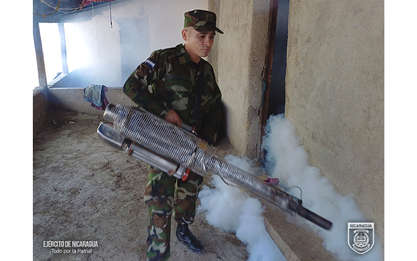 El Ejército de Nicaragua consecuente con el lema de que “Somos el Pueblo mismo uniformado, trabajando en su propio beneficio”, del 1 al 8 de noviembre de 2024, a través del 1 Comando Militar Regional, en coordinación con el Ministerio de Salud (MINSA), participó en jornada de fumigación en los municipios de Palacagüina, Somoto y San José de Cusmapa, departamento de Madriz, así como en el municipio de Pueblo Nuevo, departamento de Estelí, con el objetivo de eliminar criaderos de mosquitos transmisores del dengue y otras enfermedades.